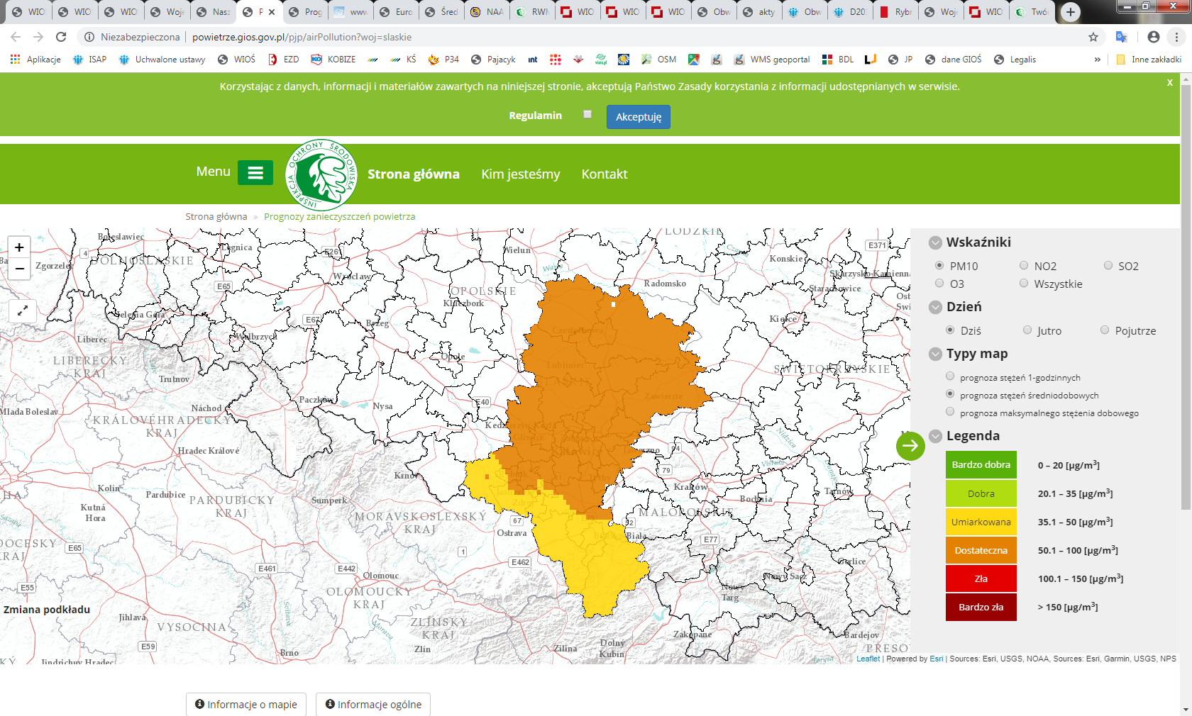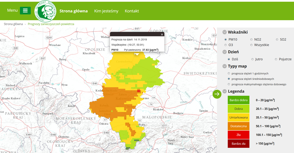 * Mapy z prognozami stężeń jednogodzinnych, średniodobowych, maksymalnego stężenia dobowego, maksymalnego stężenia 8-godzinnego kroczącego znajdują się na stronie internetowej Głównego Inspektoratu Ochrony Środowiska w Warszawie http://www.gios.gov.pl w zakładce „Jakość Powietrza – Prognozy Jakości Powietrza/Krótkoterminowe/Prognozy wojewódzkie/Śląskie” (link http://powietrze.gios.gov.pl/pjp/airPollution?woj=slaskie).