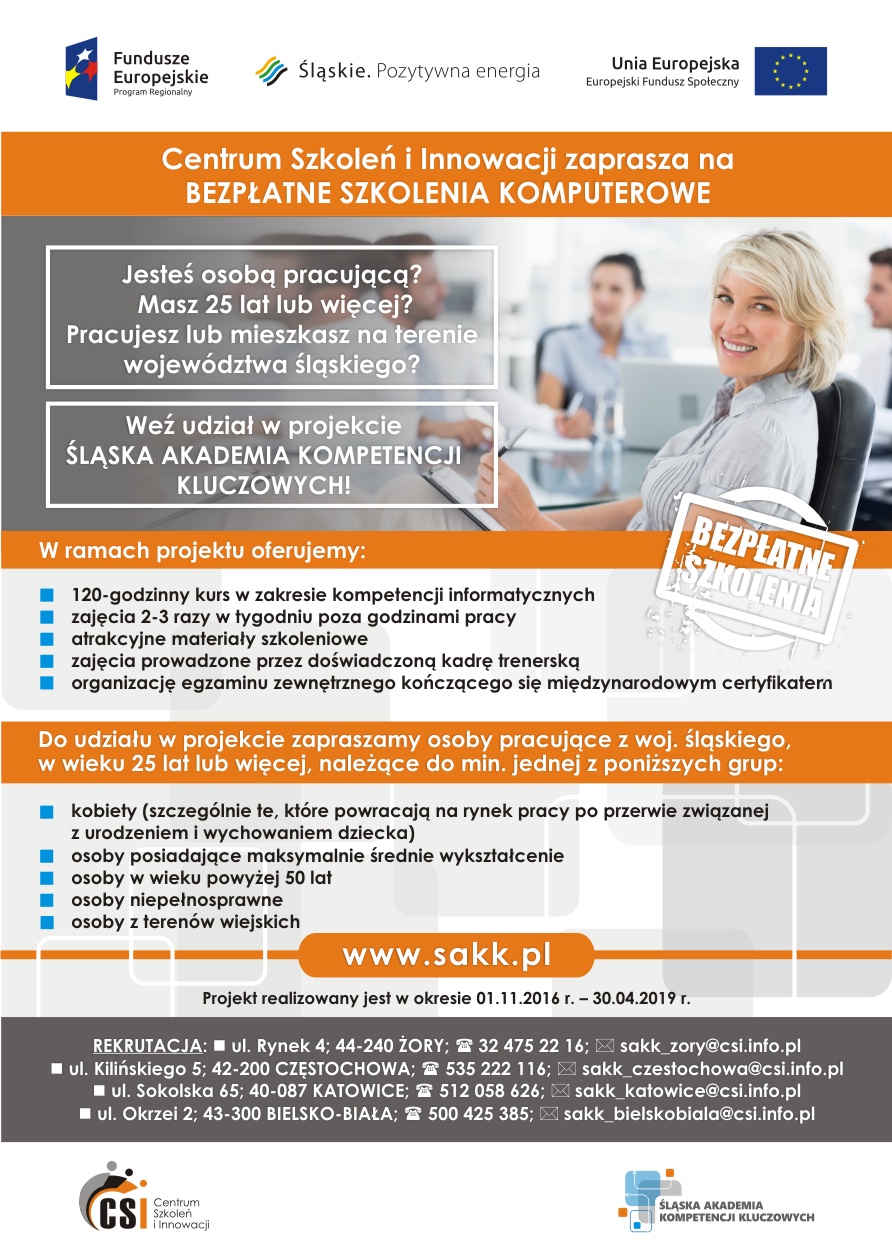 Nr RPSL.11.04.03-24-02E8/15, Regionalny Program Operacyjny województwa Śląskiego, Oś 11. Wzmocnienie potencjału edukacyjnego,  Działanie 11.4 Podnoszenie kwalifikacji zawodowych osób dorosłych, Poddziałanie 11.4.3 Kształcenie Ustawiczne, który współfinansowany jest ze środków Europejskiego Funduszu Społecznego.