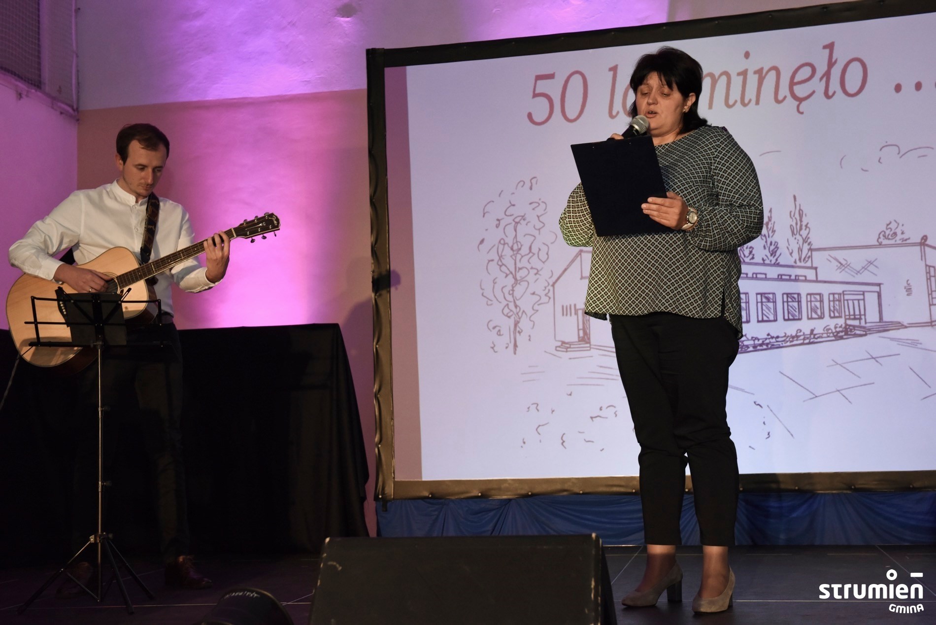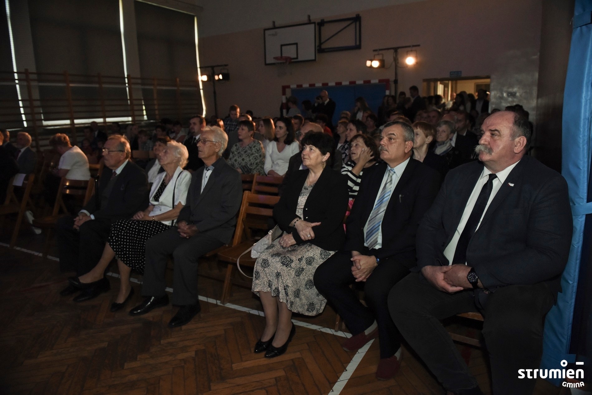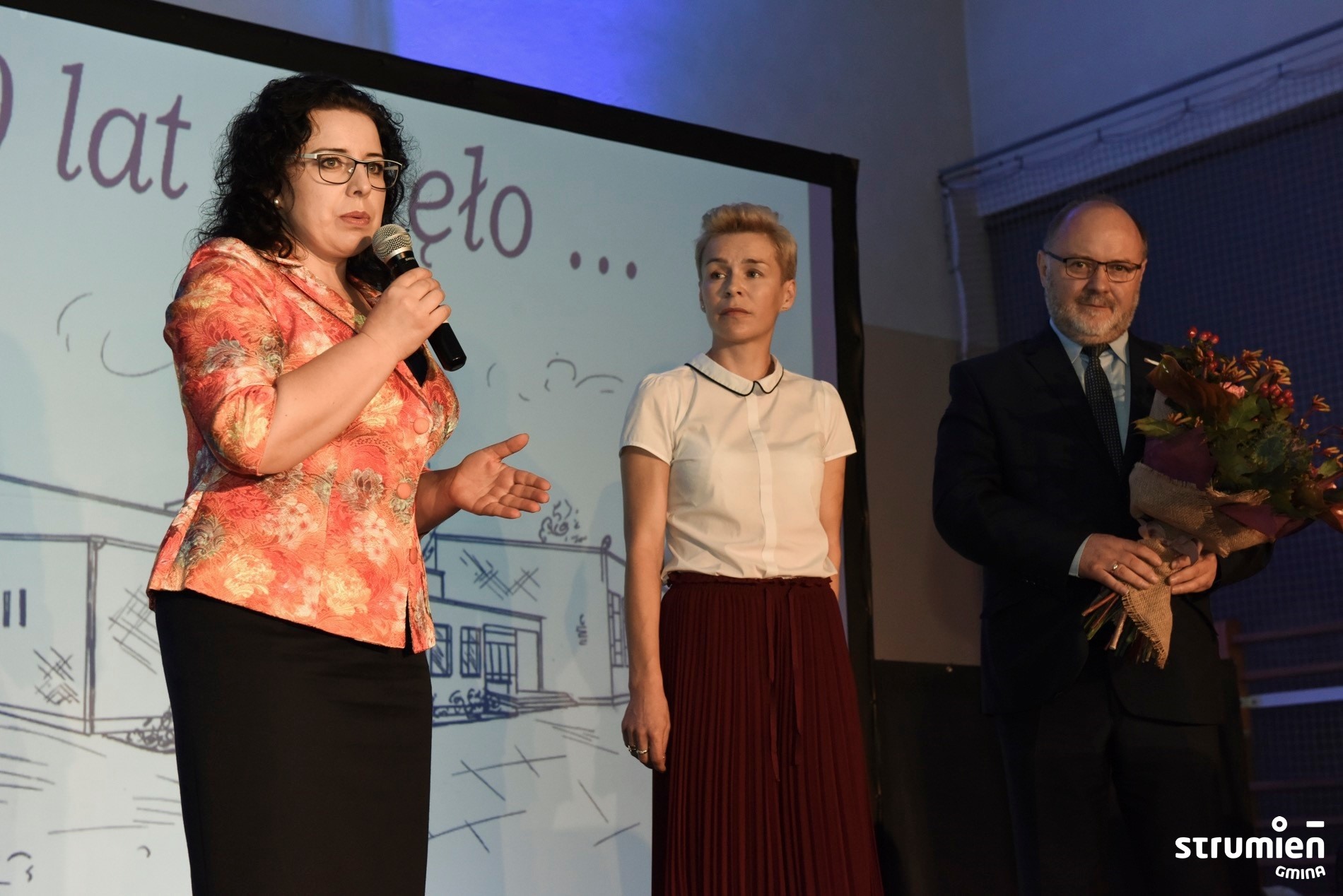 – Jubileusz szkoły to niezwykłe wydarzenie dla całej społeczności gminnej. Jest mi niezwykle miło, że w obecności uczniów, całej kadry pedagogicznej, absolwentów, byłych nauczycieli i pracowników oraz sympatyków szkoły, wspólnie możemy świętować i wspominać. Miniony czas to czas wyzwań, ale i radości z osiągnięć uczniów. Każdym kolejnym rocznikom wpajali Państwo i nadal wpajają wiarę w siebie, wytrwałość w realizacji podjętych celów i marzeń, by pamiętali, że uczą się dla samych siebie. Szkoła, bez wątpienia jest centrum kulturalnym wsi. Jestem dumna z tego, że tak aktywna placówka działa właśnie w gminie Strumień. – mówiła Burmistrz Strumienia Anna Grygierek