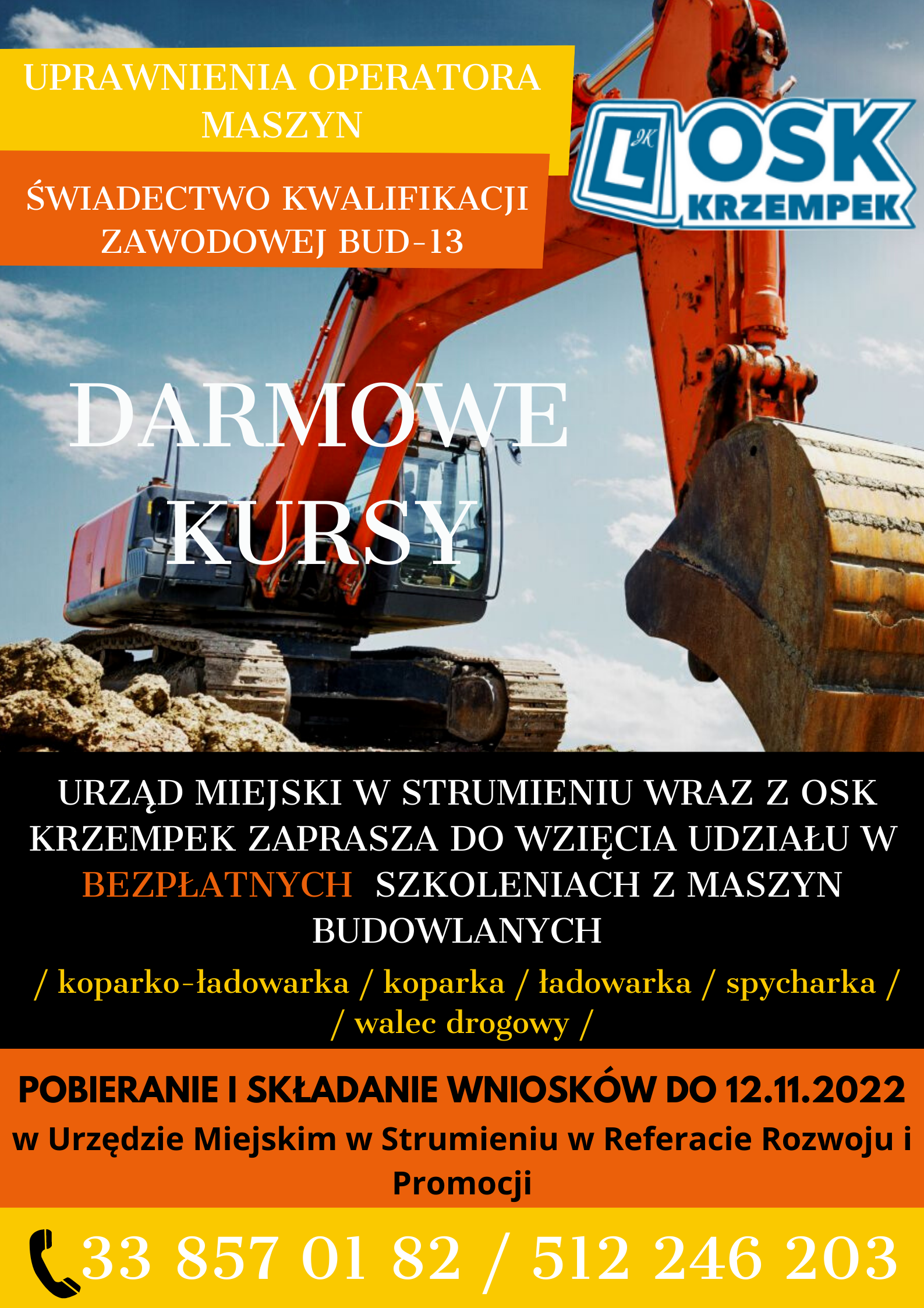 Urząd Miejski w Strumieniu wraz z OSK Krzempek  zapraszają do udziału w bezpłatnych szkoleniach z maszyn budowlanych: koparko-ładowarka, koparka, ładowarka, spycharka, walec drogowy.