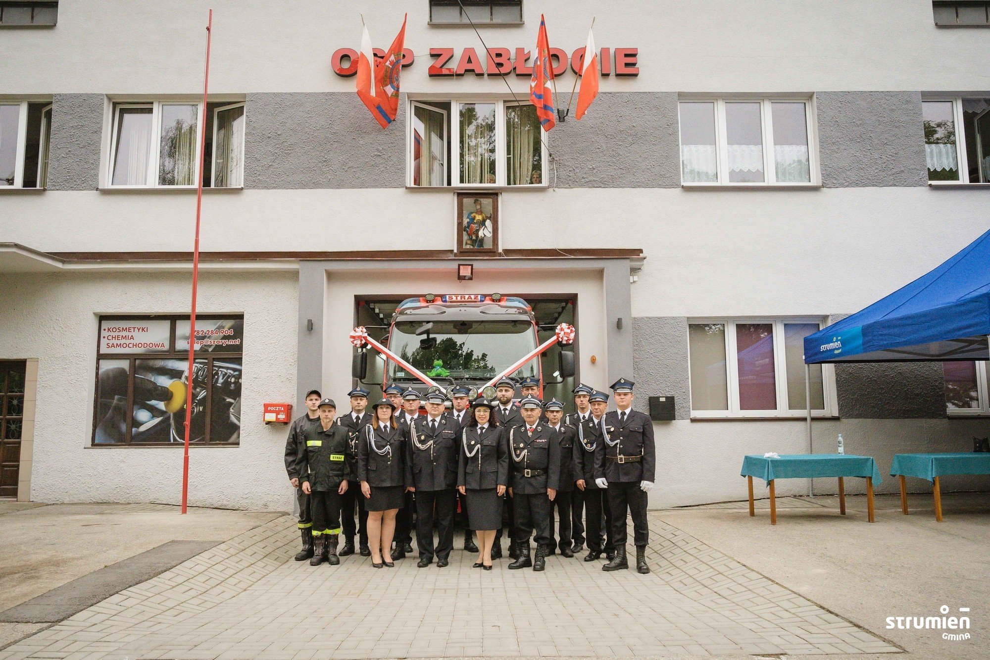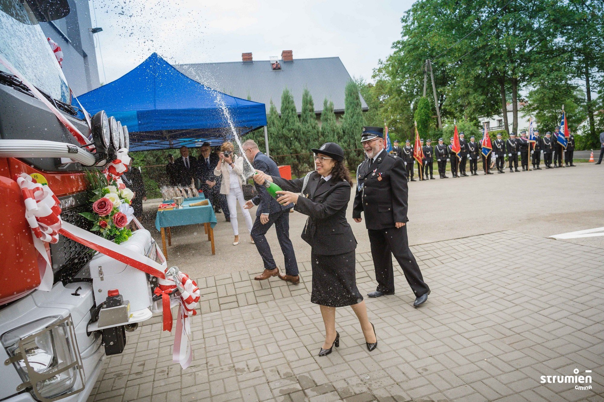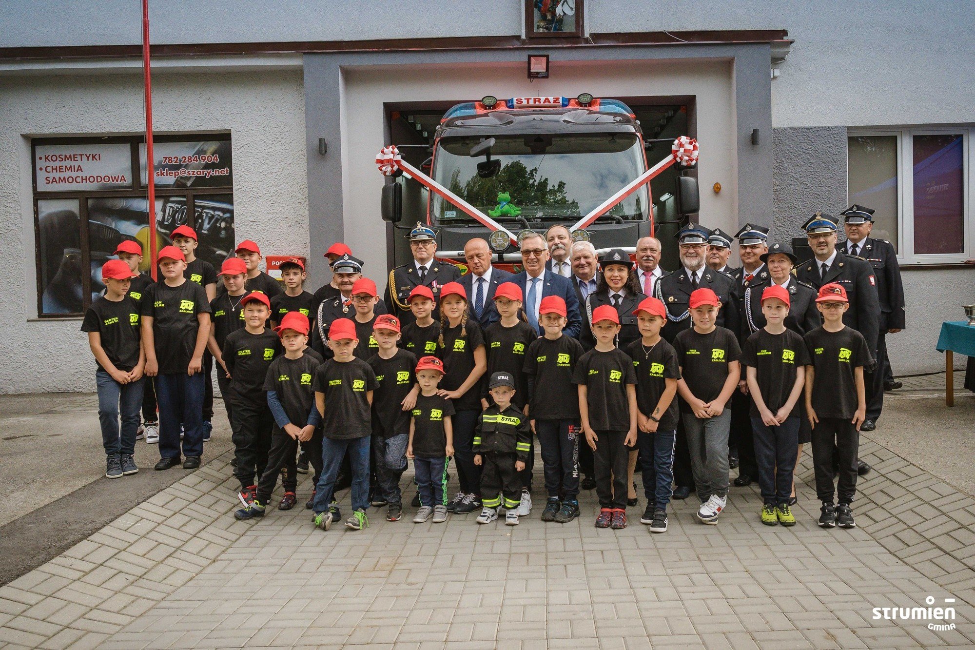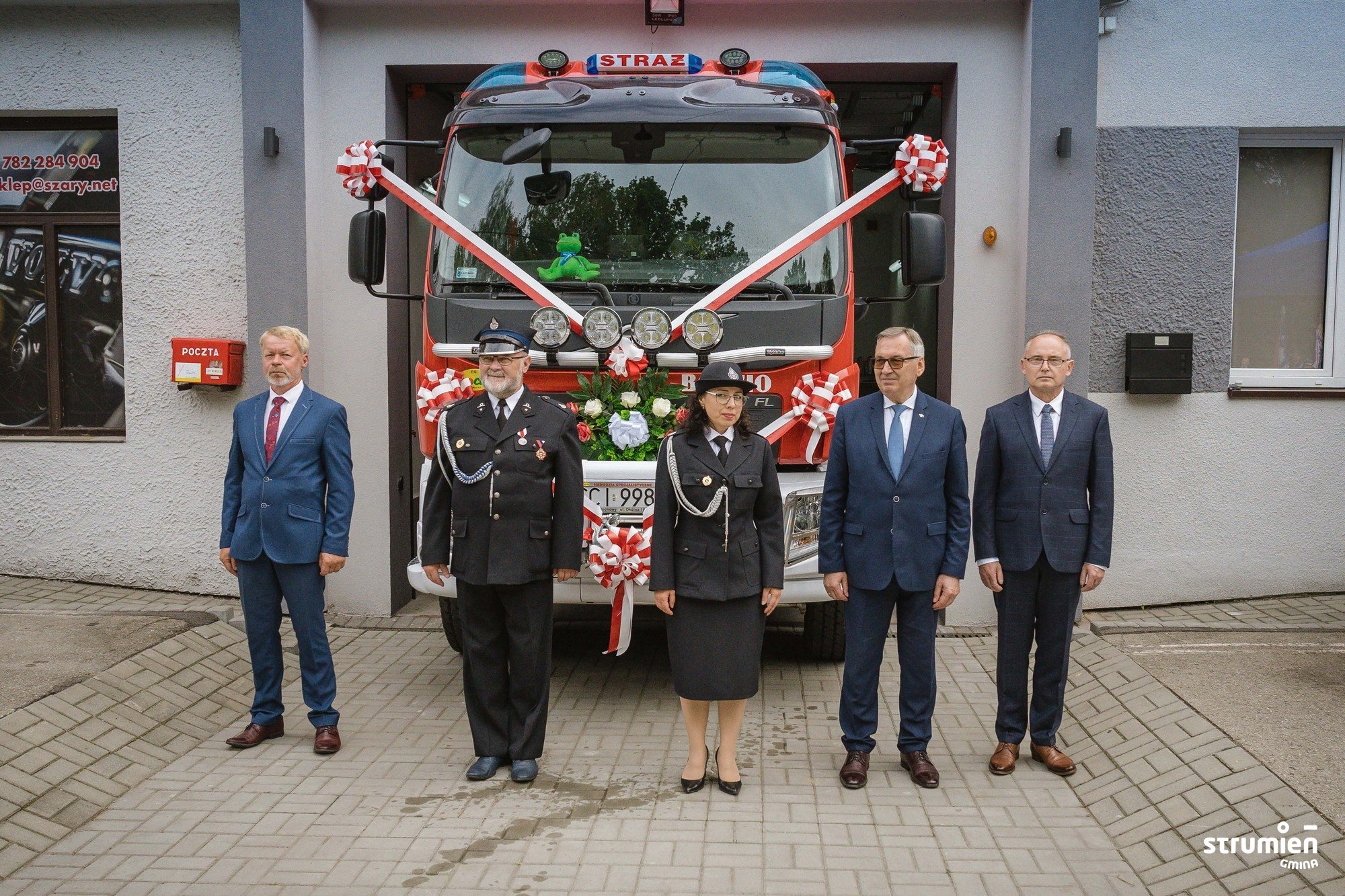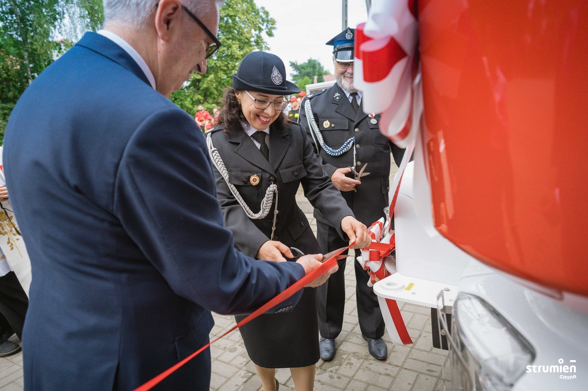 Ważnym punktem uroczystości było poświęcenie i oficjalne przekazanie jednostce nowego średniego samochodu ratowniczo-gaśniczego. Jest to pojazd na podwoziu VOLVO z napędem 4x4. Samochód służy jednostce już od 2020 r., jednak z uwagi na obostrzenia związane z COVID uroczystość przekazania samochodu została odłożona w czasie. Zakup pojazdu został sfinansowany ze środków budżetowych Gminy Strumień. Prócz tego udało się uzyskać dofinansowanie na ten cel z Wojewódzkiego Funduszu Ochrony Środowiska i Gospodarki Wodnej w Katowicach, z Narodowego Funduszu Ochrony Środowiska i Gospodarki Wodnej w Warszawie z Ministerstwa Spraw Wewnętrznych i Administracji oraz budżetu Województwa Śląskiego. Jednostka zabezpieczyła na ten cel również środki własne. Akt przekazania samochodu pożarniczego odczytał Przewodniczący Rady Miejskiej Czesław Greń.