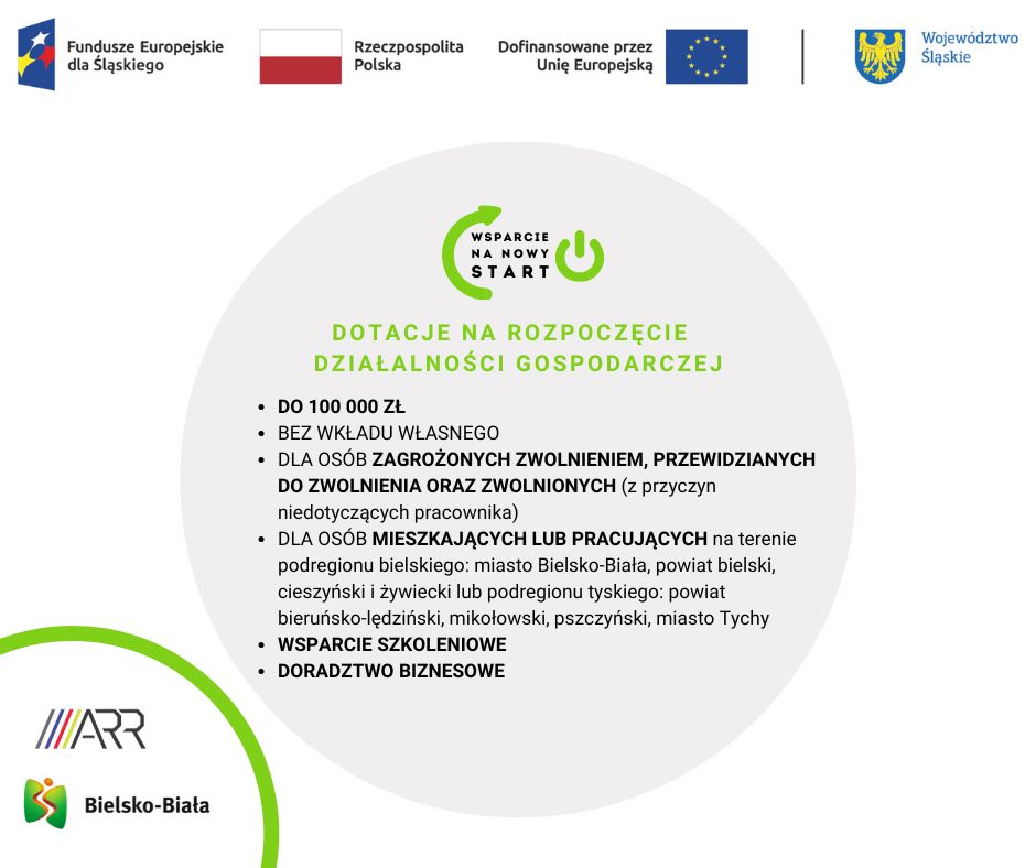 Projekt daje możliwości uzyskania dotacji na założenie działalności gospodarczej mieszkańcom lub osobom pracującym na terenie podregionu bielskiego: miasto Bielsko-Biała, powiat bielski, cieszyński i żywiecki lub podregionu tyskiego: powiat bieruńsko-lędziński, mikołowski, pszczyński, miasto Tychy, zagrożonym, przewidzianym do zwolnienia lub zwolnionym (w okresie po 28 maja 2021 r.) z przyczyn niedotyczących pracownika.