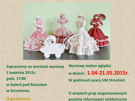 Wernisaż odbędzie się 1 kwietnia 2015r., godz. 17.00 w Galerii Pod Ratuszem w Strumieniu. Wystawę można oglądać od 1 kwietnia do 21 maja 2015r. w godzinach pracy Urzędu Miejskiego. O wizytach grup zorganizowanych prosimy informować telefonicznie pod nr tel.: 781 727 772