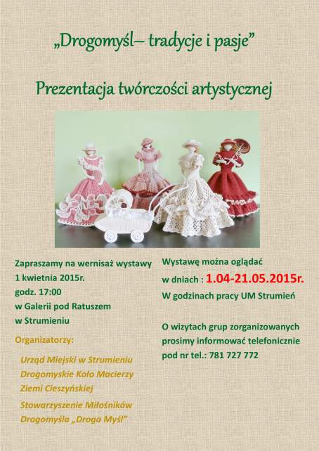 Urząd Miejski w Strumieniu, Drogomyskie Koło Macierzy Ziemi Cieszyńskiej oraz Stowarzyszenie Miłośników Drogomyśla „Droga Myśl” serdecznie zapraszają na wernisaż wystawy „Drogomyśl - tradycje i pasje”.