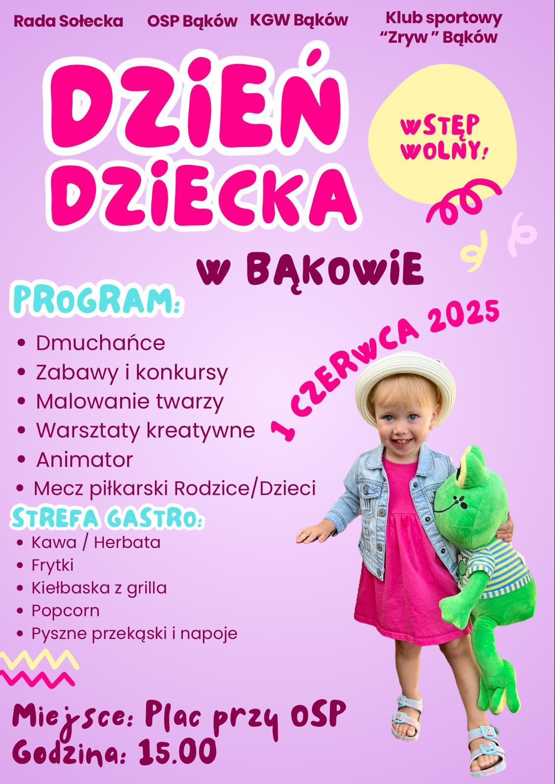 Na obchody Dnia Dziecka w Bąkowie zapraszają: Rada Sołecka Bąkowa, OSP Bąków, KGW Bąków i LKS Zryw Bąków
