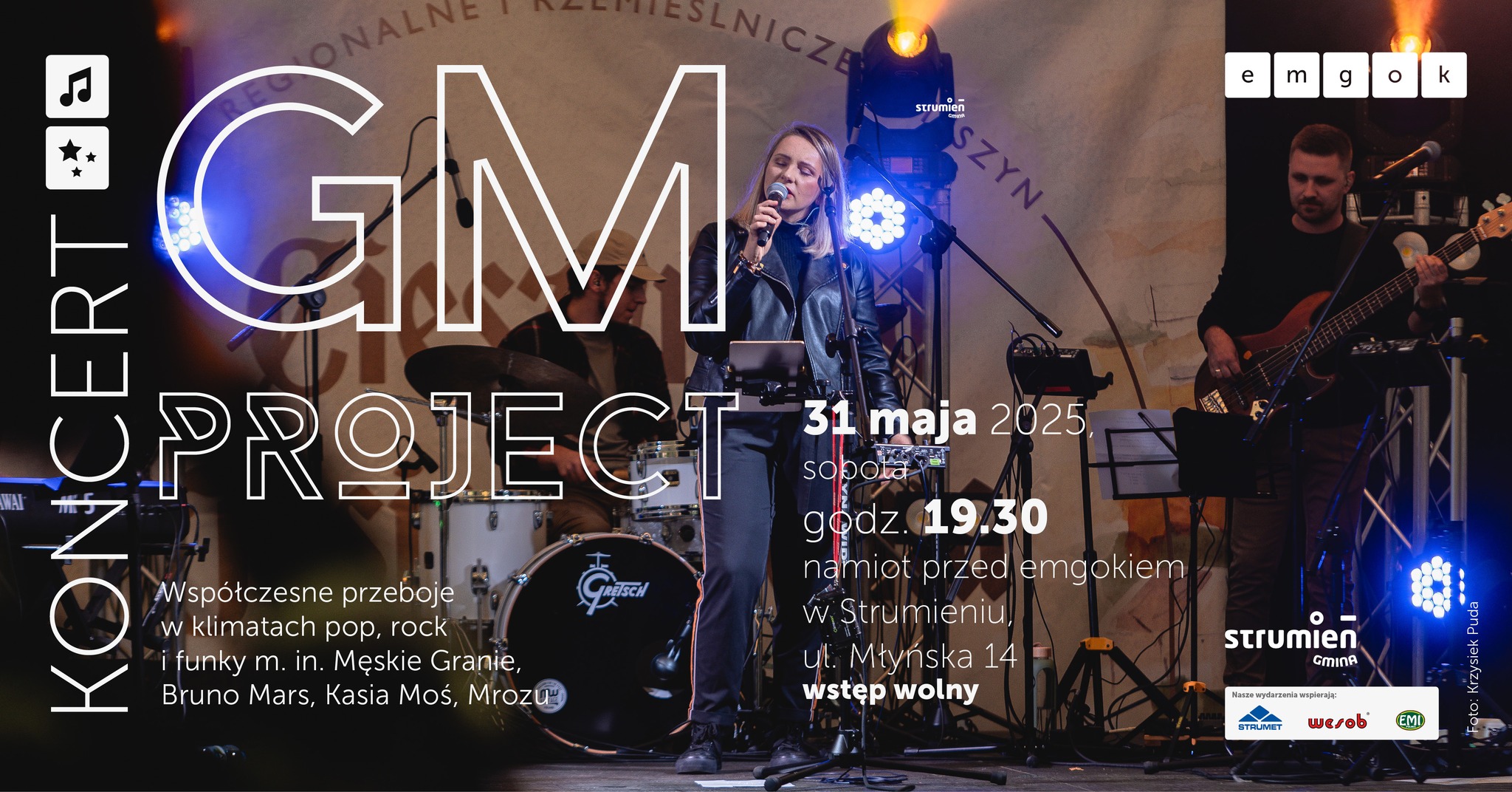 Koncert współczesnych przebojów w klimatach pop, rock i funky (m. in. Męskie Granie, Bruno Mars, Kasia Moś, Mrozu) w wykonaniu zespołu GM PROJECT. Koncert plenerowy odbędzie się w namiocie na zielonym terenie przed strumieńskim emgokiem. Koncert w ramach Bardzo Kulturalnego Dnia Dziecka. Wstęp wolny!