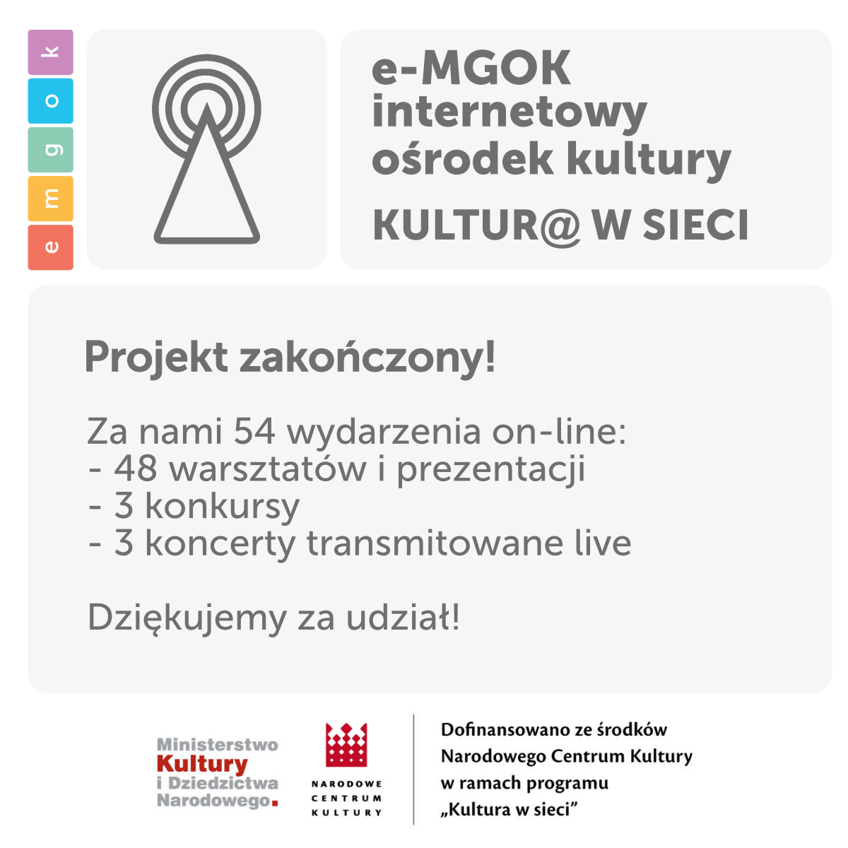 Projekt „e-mgok - internetowy ośrodek kultury" był realną odpowiedzią na potrzebę dostępu naszych mieszkańców do kultury zgłaszaną jeszcze przed rozpoczęciem działań projektowych i potwierdzoną ich aktywnością w sieci podczas realizacji projektu. Oferta bez wątpienia stanowiła atrakcyjne i bezpieczne źródło dostępu do wartościowych propozycji kulturalnych z zachowaniem wprowadzonych pandemicznych obostrzeń i z wykorzystaniem Internetu. Dzięki działaniom został wykorzystany potencjał drzemiący w ludziach, którego nie można było zmarnować i można było popularyzować wartościowe spędzanie wolnego czasu.