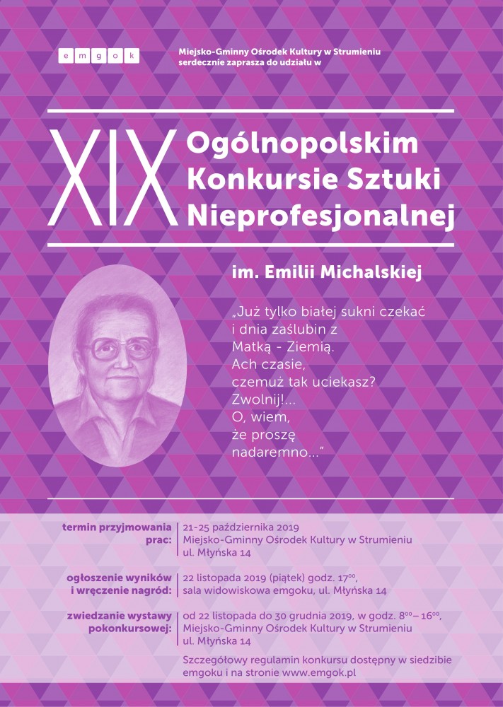 Miejsko-Gminny Ośrodek Kultury w Strumieniu serdecznie zaprasza wszystkich miłośników sztuki nieprofesjonalnej na finał XIX edycji Ogólnopolskiego Konkursu Sztuki Nieprofesjonalnej im. Emilii Michalskiej pt. "Już tylko białej sukni czekać i dnia zaślubin z Matką – Ziemią…"