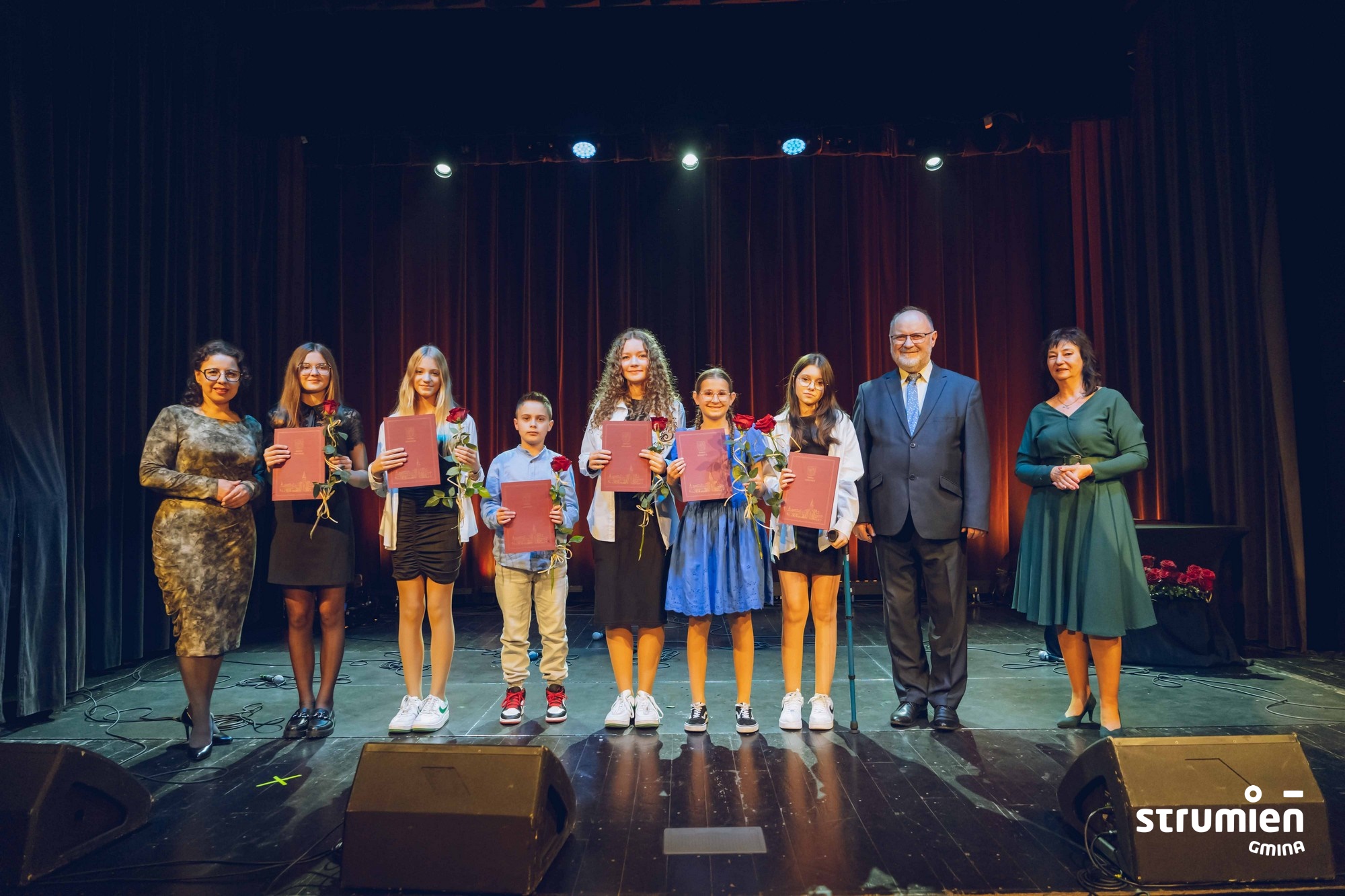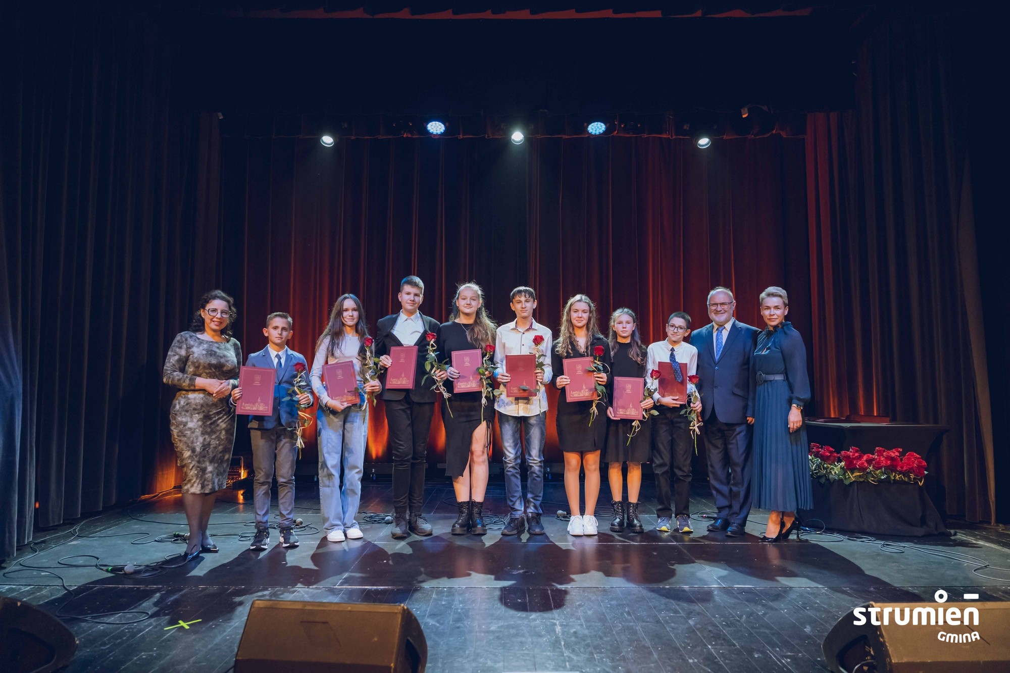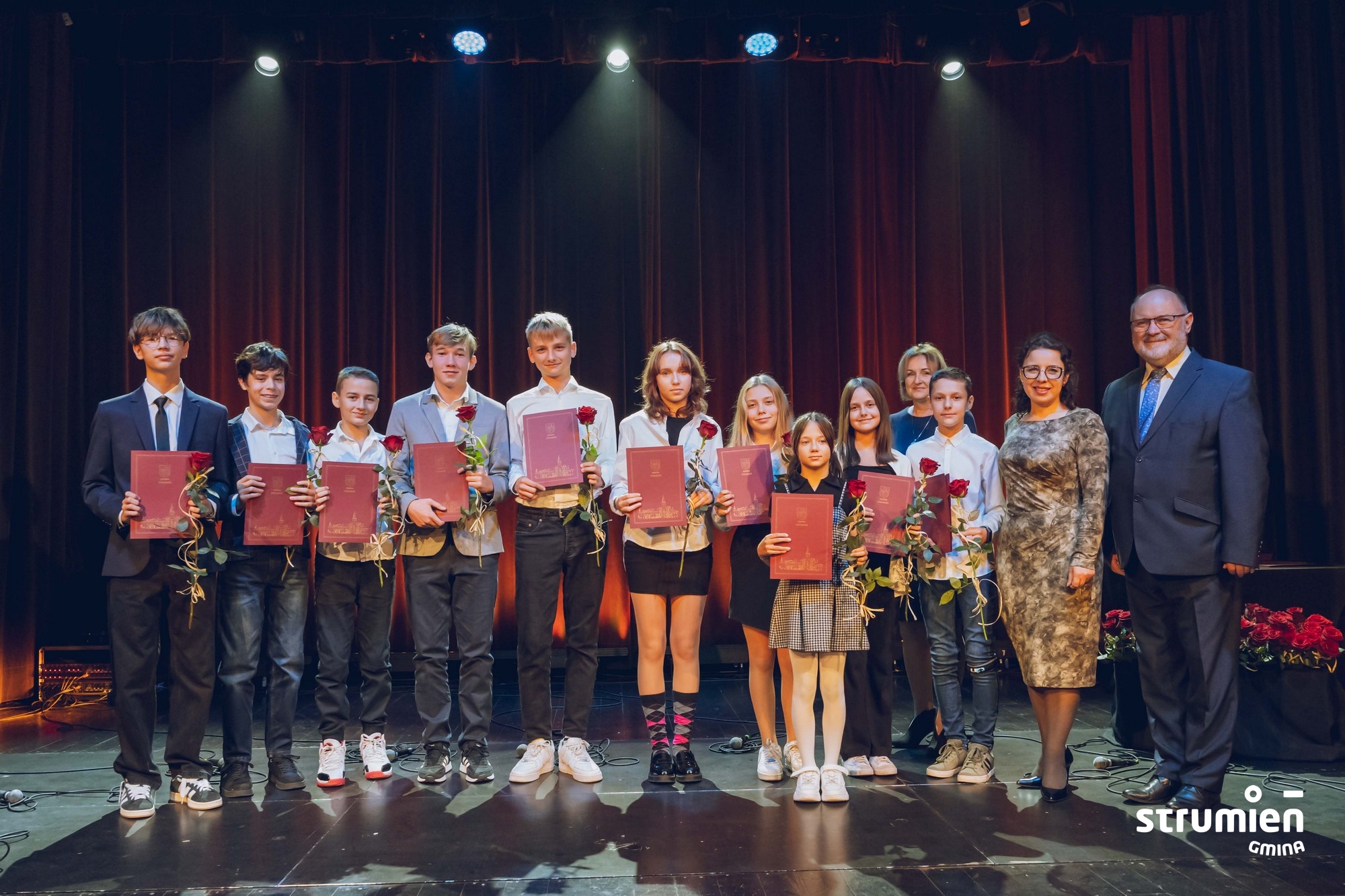 Na początku uroczystości mogliśmy podziwiać występ utalentowanej grupy wokalnej z emgoku, prowadzonej przez Gabrielę Szymańską. Po muzycznej części przyszedł czas na to, co najważniejsze – wyróżnienie uczniów, którzy swoją pracą i zaangażowaniem osiągnęli imponujące wyniki w nauce. W tegorocznej edycji programu stypendialnego wyróżniono aż 52 uczniów: 40 za wyniki w nauce, a 12 za szczególne osiągnięcia naukowe. Wśród wyróżnionych znaleźli się uczniowie z każdej szkoły gminy Strumień: