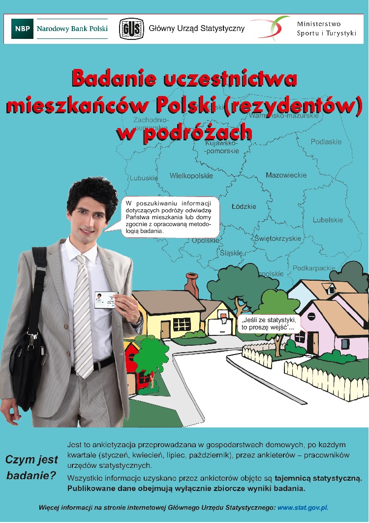 Uprzejmie informujemy, że w dniach od 2 do 20 stycznia 2018 r. na terenie całego kraju w wylosowanych mieszkaniach zostanie przeprowadzone badanie reprezentacyjne dotyczące uczestnictwa mieszkańców Polski w podróżach.