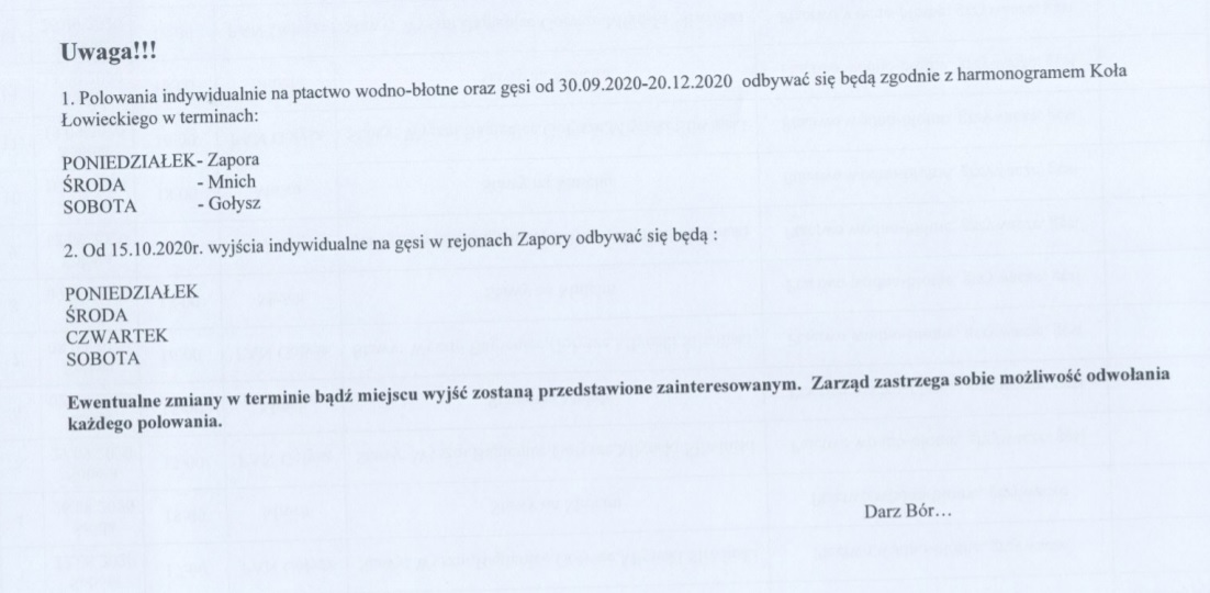 Natomiast polowania indywidualne na gęsi i ptactwo wodno-błotne od 30.09.2020 – 20.12.2020 odbywać się będą zgodnie z harmonogramem Koła Łowieckiego w terminach: