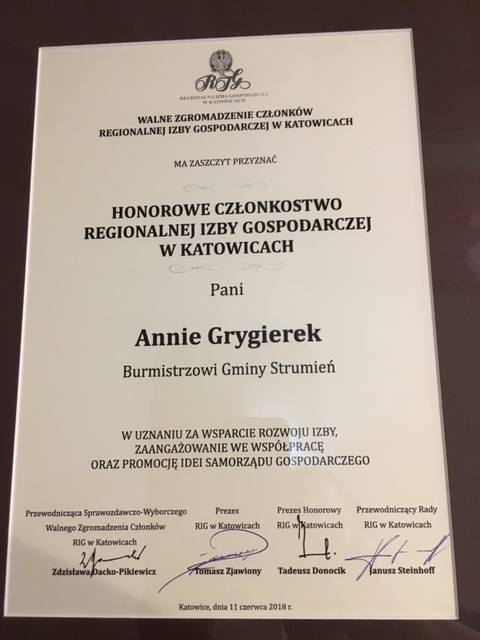 Honorowe członkostwo Regionalnej Izby Gospodarczej otrzymała Anna Grygierek burmistrz Strumienia,  wraz z wójtem Jasienicy Januszem Pierzyną. Wręczenie honorowego członkostwa odbyło się w poniedziałek 11 czerwca w Katowicach podczas Walnego Sprawozdawczo-Wyborczego Zgromadzenia Członków Regionalnej Izby Gospodarczej.