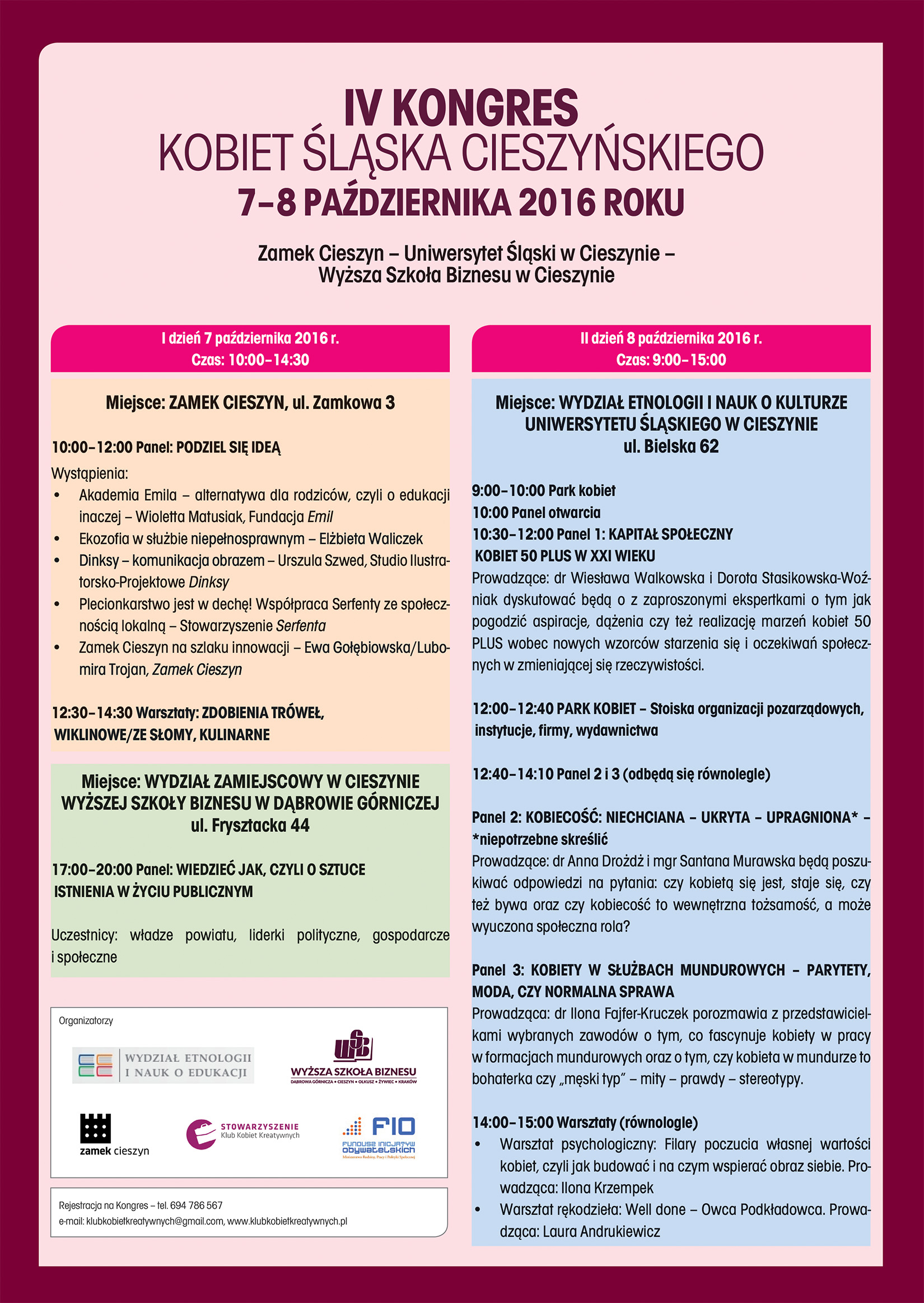 Gospodarzem drugiego dnia kongresu będzie Wydział Etnologii i Nauk o Edukacji Uniwersytetu Śląskiego w Cieszynie, gdzie prowadzone będą rozmowy m.in. o kapitale społecznym kobiet w XXI wieku – ich niechcianej – ukrytej- upragnionej kobiecości oraz o parytetach i sytuacji kobiet w służbach mundurowych. Odbędzie się również warsztat psychologiczny pt. „ Filary poczucia własnej wartości kobiet, czyli jak budować i na czym wspierać obraz siebie.