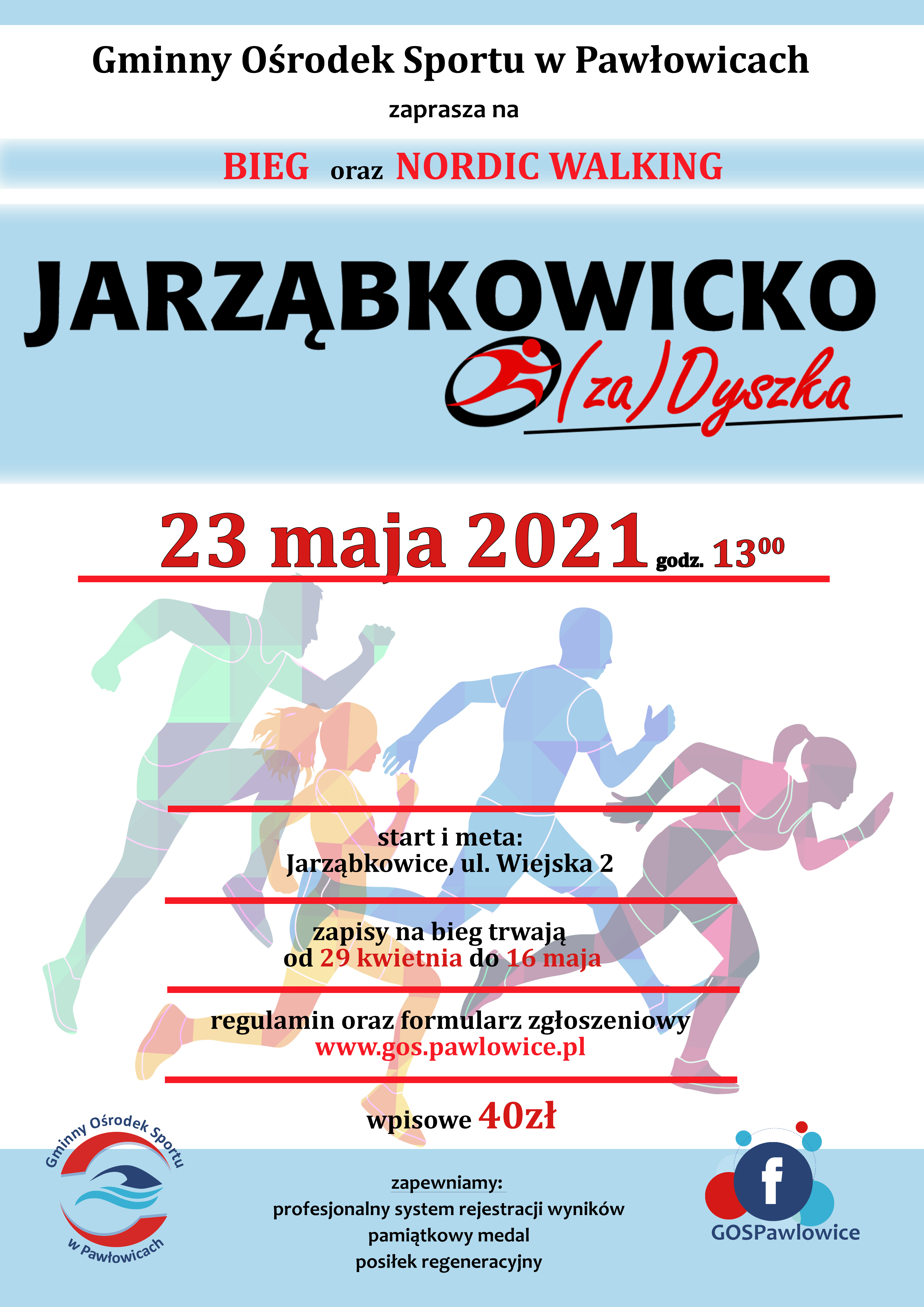 Dyrektor Gminnego Ośrodka Sportu w Pawłowicach informuje, że w niedzielę 23 maja na terenie Bąkowa odbędzie się bieg pod nazwą „Jarząbkowicko (za)Dyszka”. W związku z tym od godz. 12.50 do 14.30 wystąpią utrudnienia komunikacyjne na obszarze trasy biegu. Trasa przebiegać będzie ulicami: Wiosenną, Szkolną oraz Jarząbkowicką w Bąkowie.