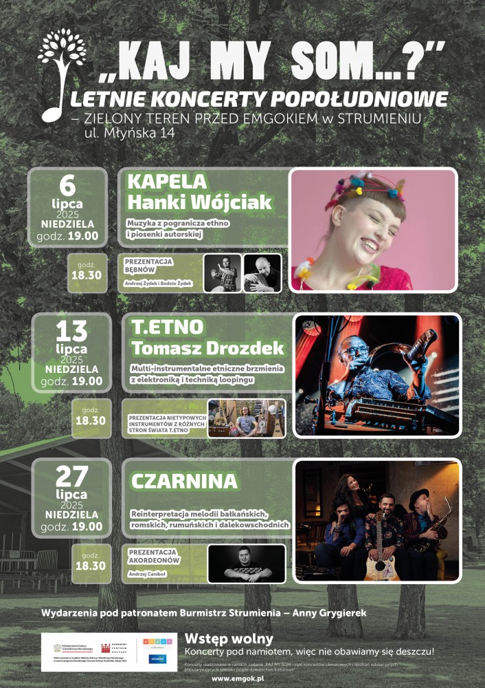 Koncerty realizowane w ramach zadania „KAJ MY SOM – cykl koncertów plenerowych i spotkań edukacyjnych popularyzujących szeroko pojęte dziedzictwo kulturowe”. Zadanie dofinansowano ze środków Ministra Kultury i Dziedzictwa Narodowego w ramach programu Narodowego Centrum Kultury EtnoPolska. Edycja 2025