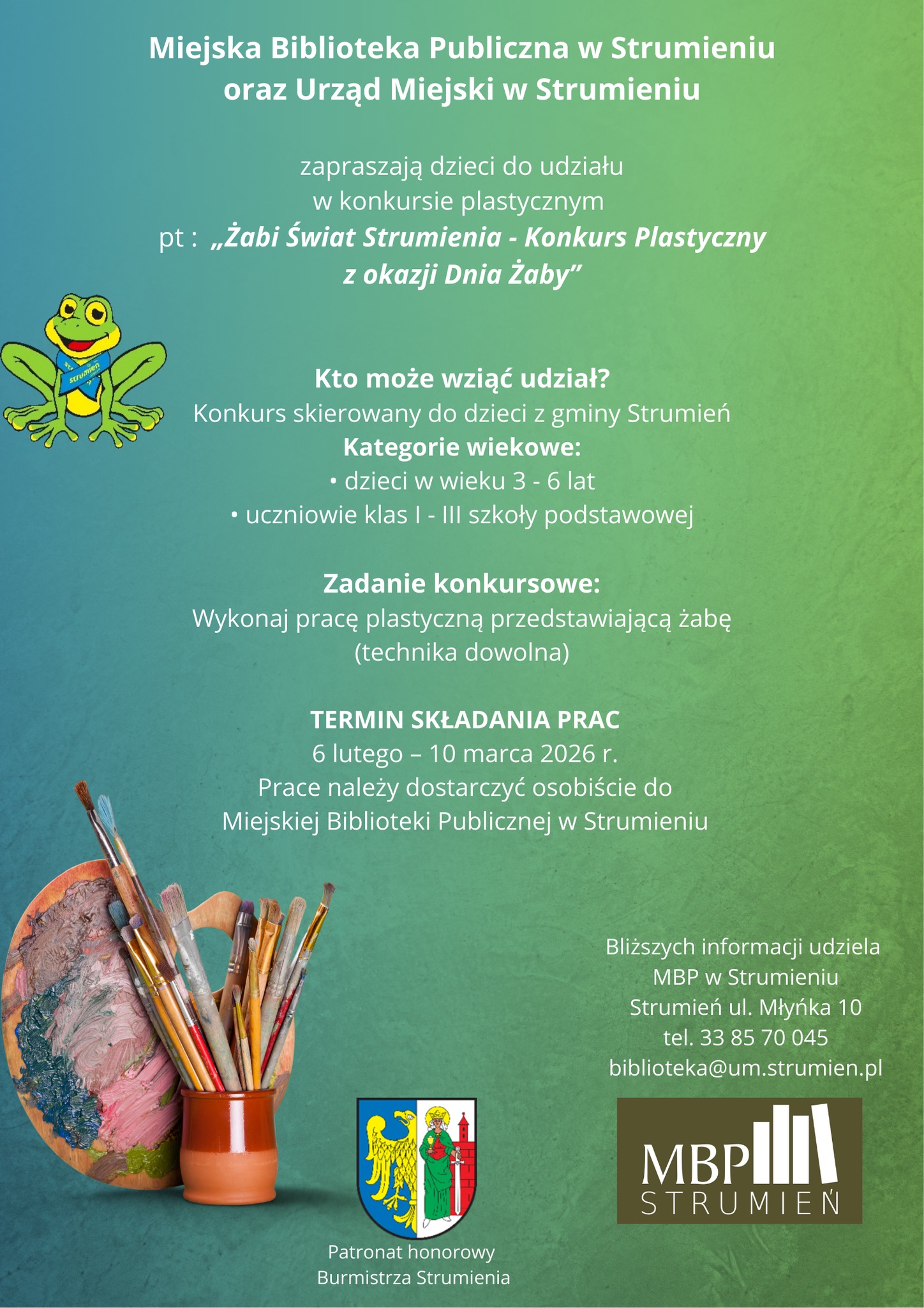 Z okazji Światowego Dnia Żaby Miejska Biblioteka Publiczna w Strumieniu we współpracy z Urzędem Miejskim w Strumieniu zapraszają najmłodszych mieszkańców gminy do udziału w konkursie plastycznym pn. „Żabi Świat Strumienia – Konkurs Plastyczny z okazji Dnia Żaby”.