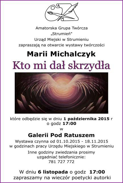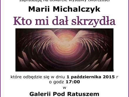 1 października serdecznie zapraszamy na wernisaż wystawy twórczości Marii Michalczyk „Kto mi dał skrzydła”. Wernisaż odbędzie się o godz. 17.00 w Galerii pod Ratuszem.