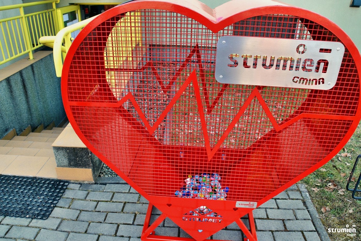 Mieszkańcy gminy Strumień nie muszą się już zastanawiać, co zrobić z nakrętkami od plastikowych butelek, gdyż w każdej miejscowości w gminie pojawiły się metalowe pojemniki w kształcie serca.