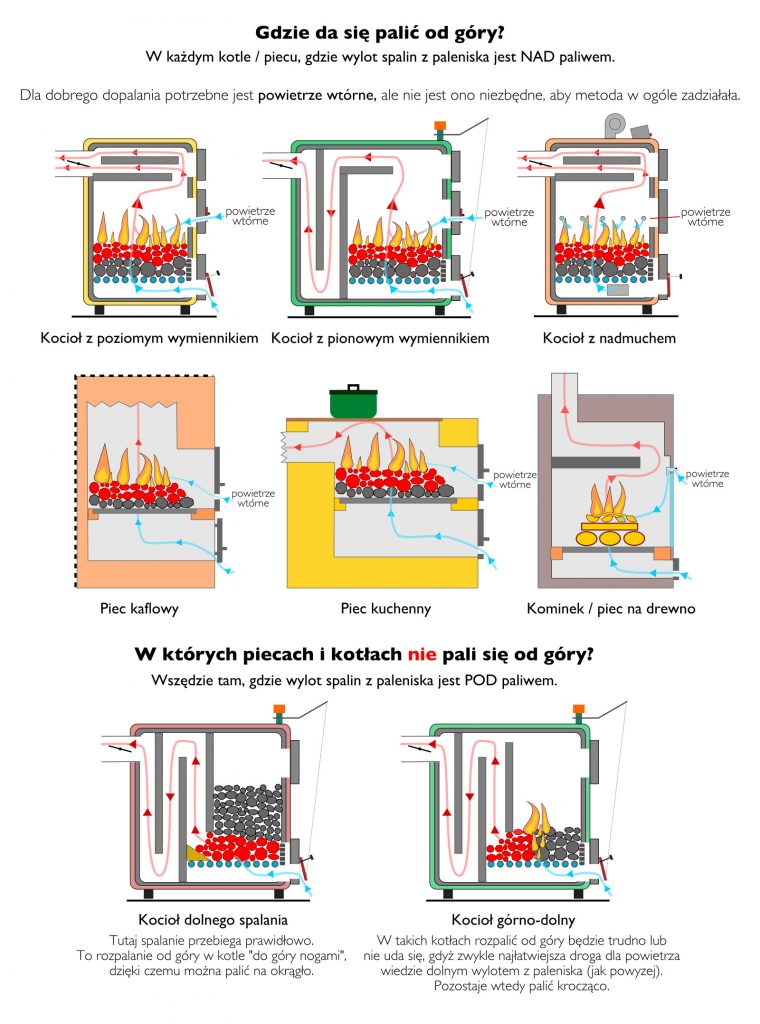 Dzięki takiej formie spalania, wszystkie gazy i spaliny emitowane z węgla i drewna spalają się jeszcze w komorze pieca, a nie ulatują przez komin na zewnątrz. Spalanie od góry pozwala także zaoszczędzić na opale, bo spalany jest on całkowicie. Przy tradycyjnym paleniu, nawet 1/3 opału w postaci pyłu wydostaje się przez komin. Stąd właśnie czarny dym, który kopci z wielu kominów w naszym regionie.