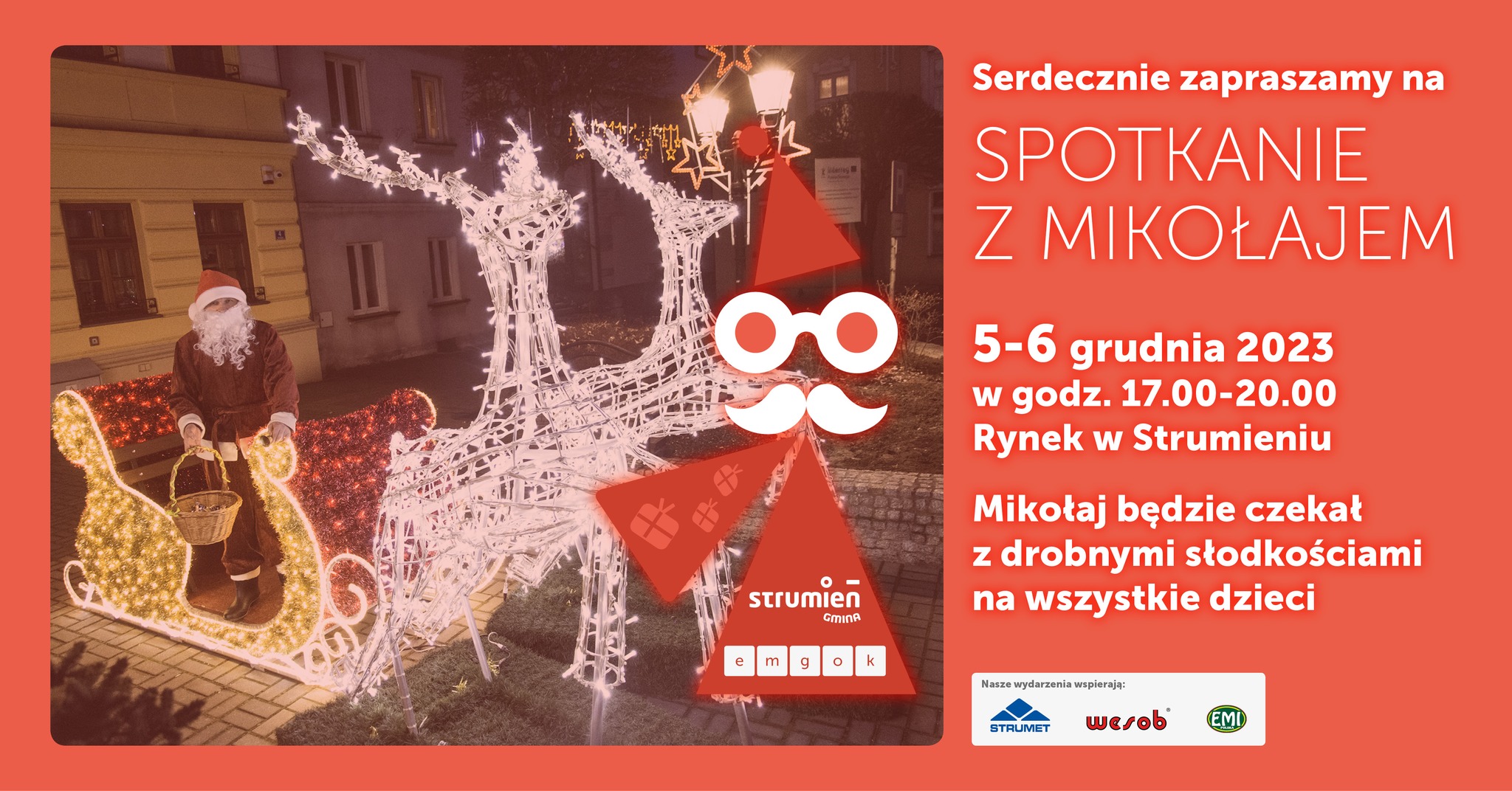 - W dniach 5-6 grudnia z radością gościmy w Strumieniu Świętego Mikołaja! Specjalny Gość będzie czekał na strumieńskim rynku w godzinach 17:00-20:00, obdarowując wszystkie dzieci drobnymi słodkościami.