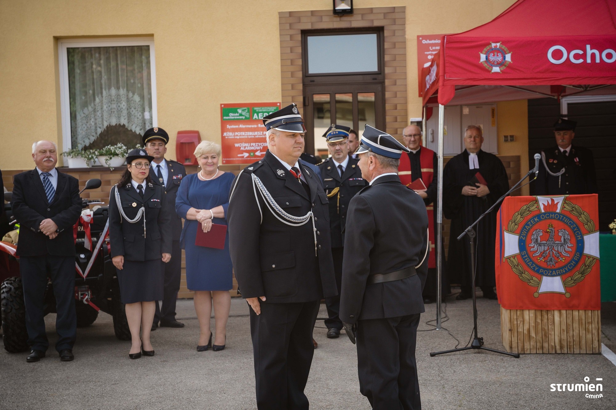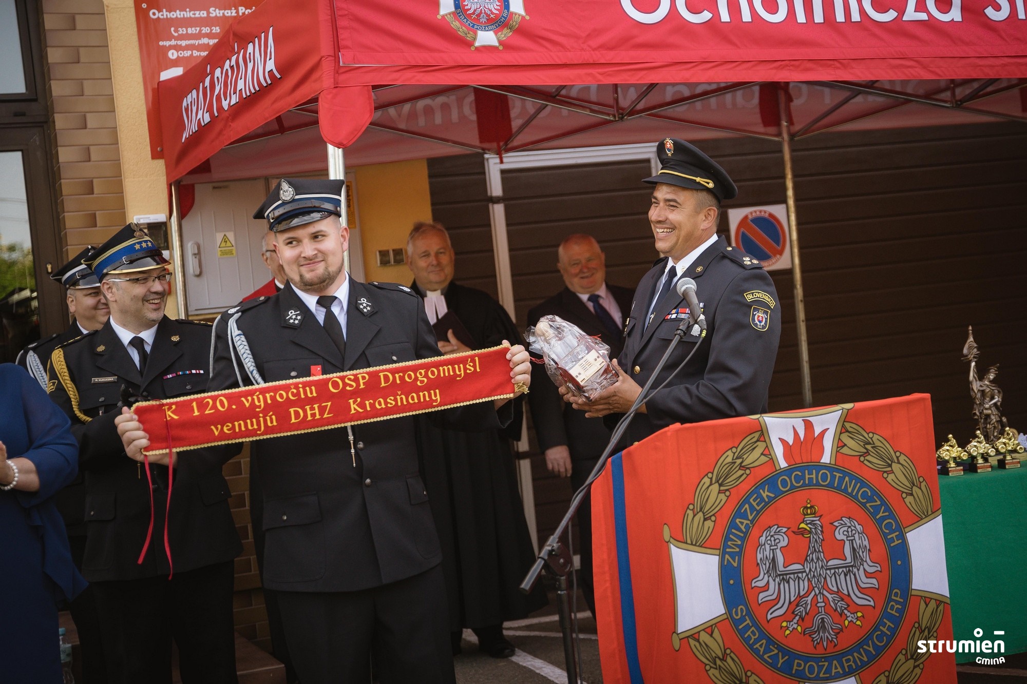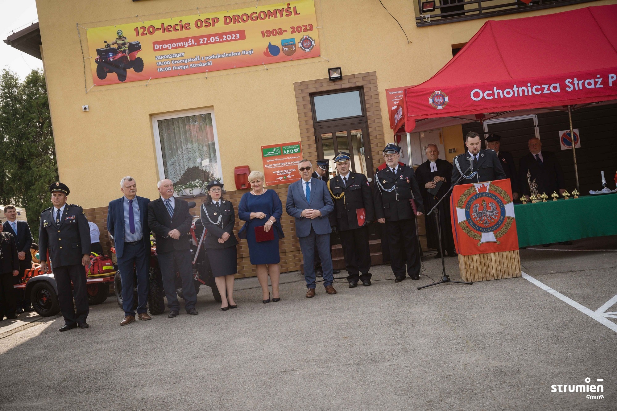 "Już 120 lat bezinteresownie stoicie na posterunku aby służyć i chronić mieszkańców. Dziękujemy Wam, ale także symbolicznie Waszym poprzednikom i założycielom za profesjonalizm, odwagę oraz nieustanną chęć niesienia pomocy potrzebującym. Tak piękny jubileusz zobowiązuje do dalszego trwania, rozwijania się i do kontynuacji tej misji przez młode pokolenia" – mówiła Burmistrz Strumienia Anna Grygierek.