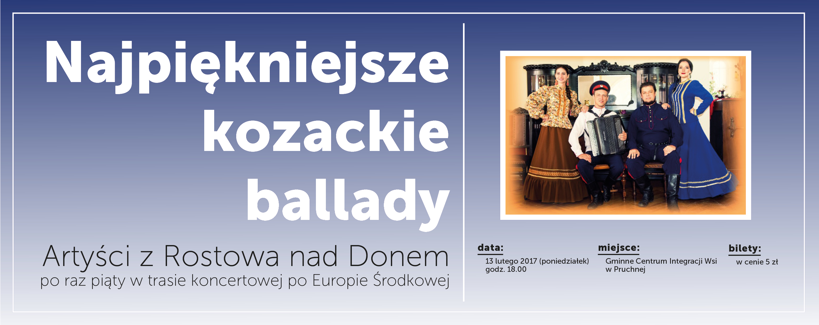 Już 13-go lutego w Gminnym Centrum Integracji Wsi w Pruchnej rozbrzmiewać będą prawdziwe kozackie ballady w wykonaniu artystów, którzy przyjadą do nas z Rostowa nad Donem. Koncert odbędzie się o godzinie 18:00. Bilety w cenie 5 złotych dostępne są w biurze Miejsko-Gminnego Ośrodka Kultury. Będzie również możliwość ich zakupu bezpośrednio przed imprezą.