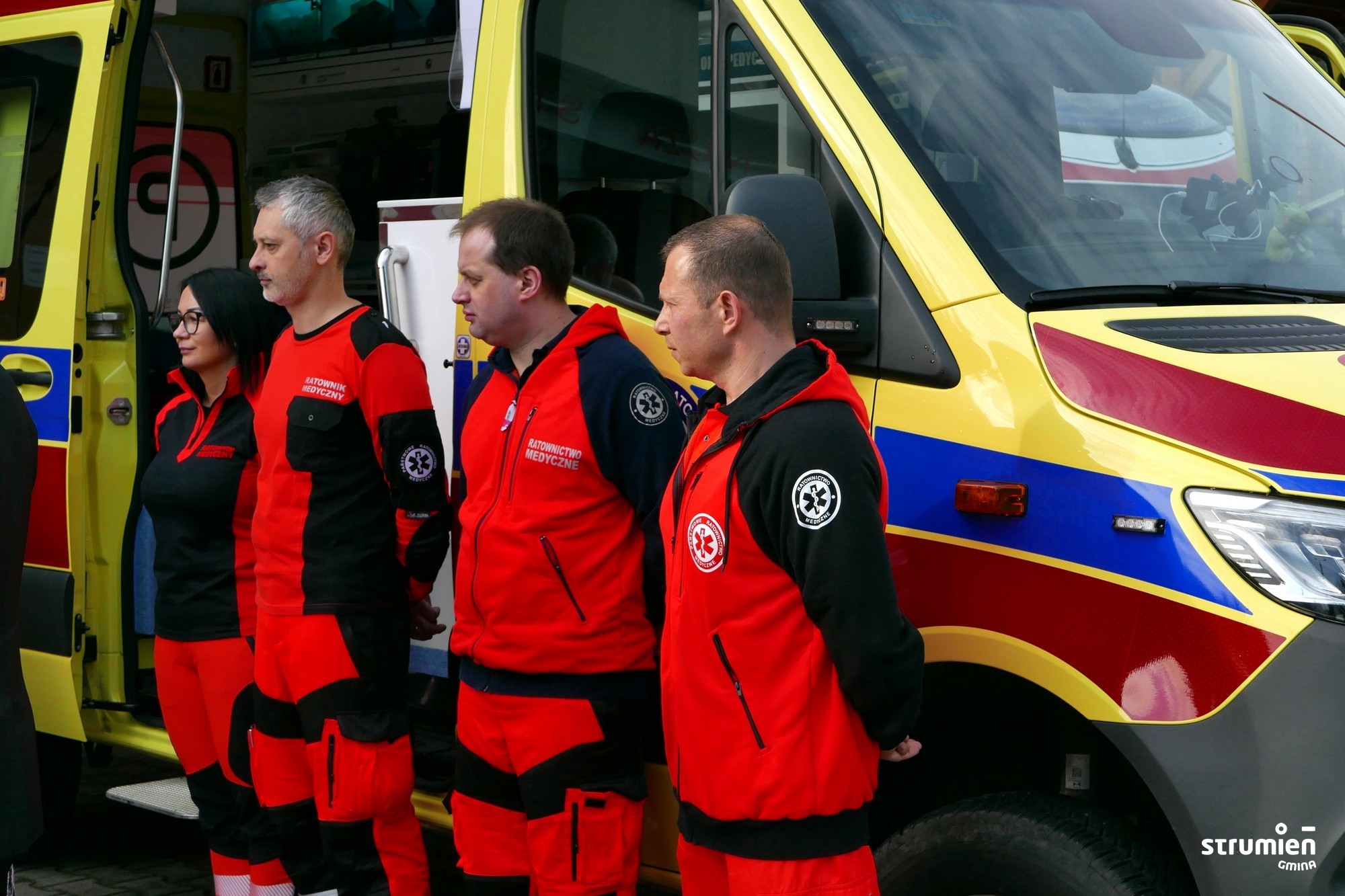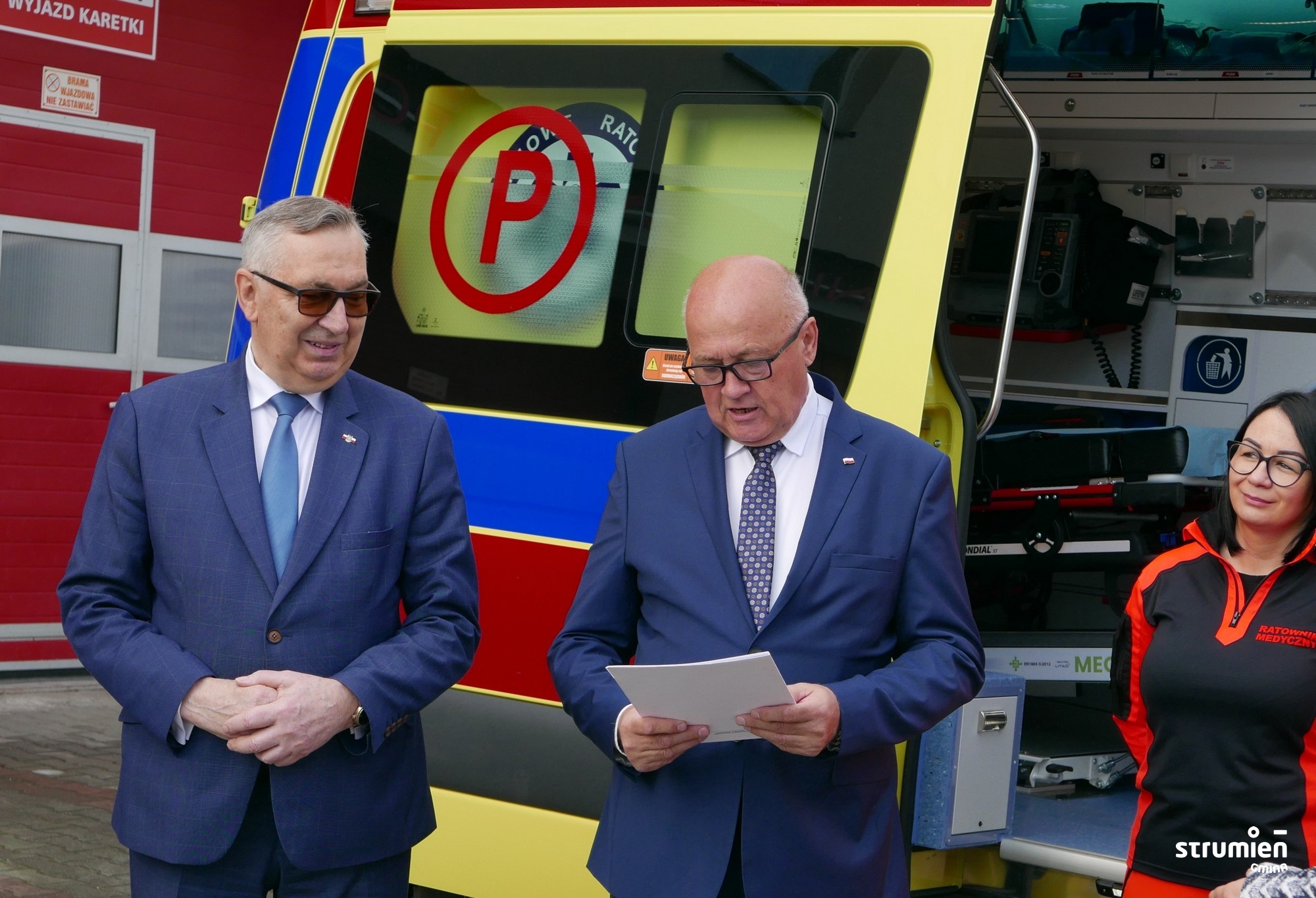 Symbolicznego przekazania nowego ambulansu dokonał Jan Kawulok Dyrektor Cieszyńskiego Pogotowia Ratunkowego. W wydarzeniu wzięli udział także m.in. Stanisław Szwed Wiceminister Rodziny i Polityki Społecznej, Mieczysław Szczurek Starosta Cieszyński, dyrekcja oraz pracownicy Cieszyńskiego Pogotowia Ratunkowego. Nie zabrakło gospodarza miejsca Burmistrz Strumienia Anny Grygierek.