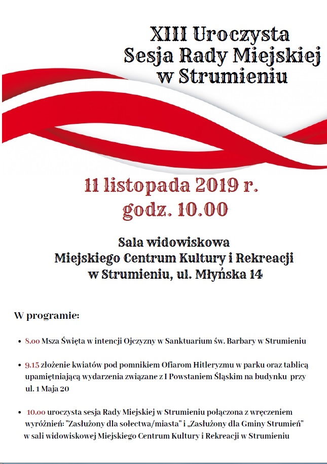 10.00 uroczysta sesja Rady Miejskiej w Strumieniu połączona z wręczeniem wyróżnień: ”Zasłużony dla sołectwa/miasta” i „Zasłużony dla Gminy Strumień” w sali widowiskowej Miejskiego Centrum Kultury i Rekreacji w Strumieniu