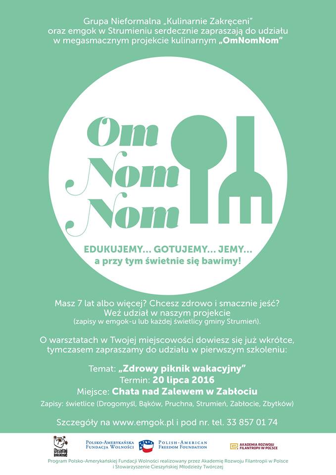 Projekt kulinarny „OmNomNom” organizowany przez Grupę Nieformalną oraz „Kulinarnie Zakręceni” oraz Miejsko-Gminny Ośrodek Kultury w Strumieniu polega na zakupieniu sprzętu i akcesoriów kuchennych oraz organizacji 25 warsztatów na terenie całej gminy w terminie od lipca do listopada 2016 roku: