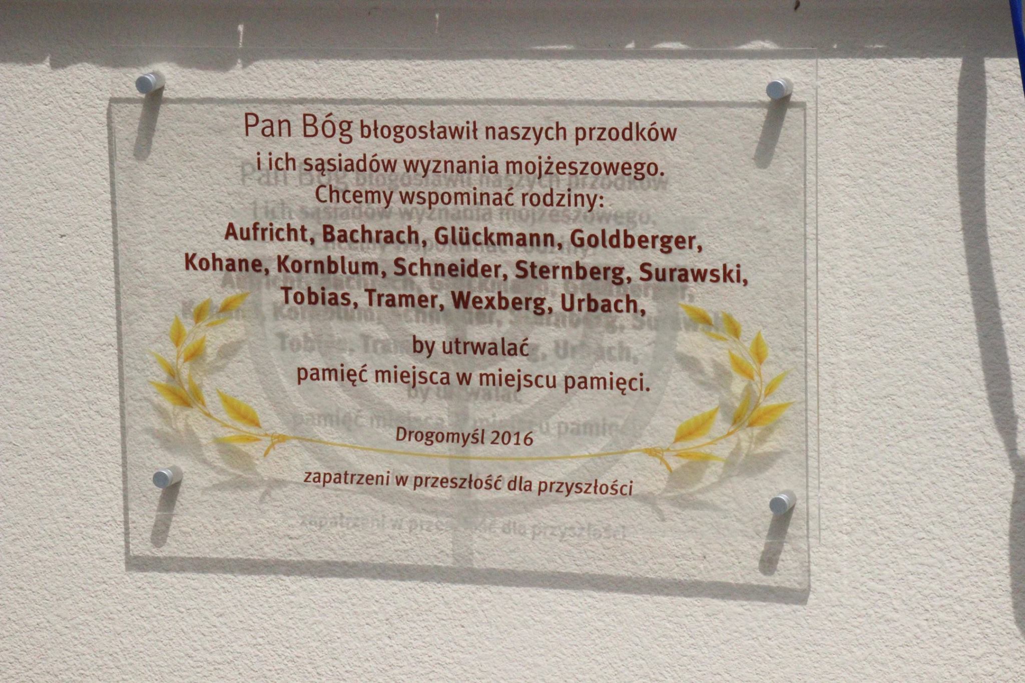 W niedzielę 19 czerwca w Drogomyślu przy kościele ewangelicko-augsburskim odbyła się ceremonia odsłonięcia tablicy upamiętniającej rodziny wyznania mojżeszowego żyjące na terenie parafii do 1939roku. Odsłonięcie tablicy poprzedziło uroczyste nabożeństwo w którym wzięła udział Burmistrz Strumienia Anna Grygierek, Przewodniczący Rady Czesław Greń, Lilla Salachna- Brzoza Członek Zarządu Powiatu Cieszyńskiego, przedstawiciele gminy żydowskiej z Bielska-Białej, Dyrekcja Zespołu Szkół w Drogomyślu, Przedstawiciele Stowarzyszenia Miłośników Drogomyśla „Droga Myśl”, Stowarzyszenia Rozwoju Wsi Pruchna oraz sołtys Zbigniew Podyma.