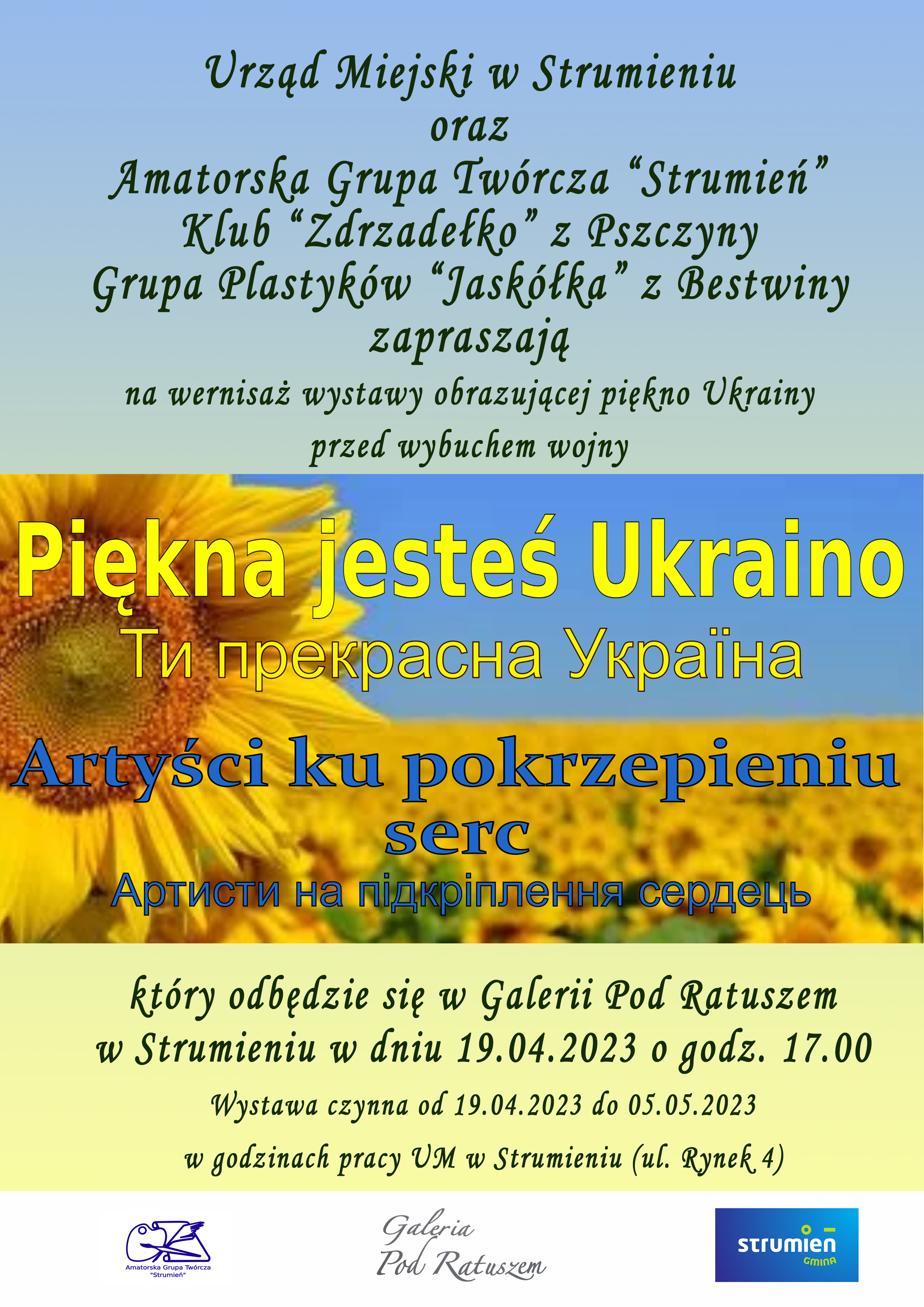 Urząd Miejski w Strumieniu oraz Amatorska Grupa Twórcza "Strumień", Klub "Zdrzadełko" z Pszczyny i Grupa Plastyków "Jaskółka" z Bestwiny zapraszają na wernisaż wystawy "Piękna jesteś Ukraino - artyści ku pokrzepieniu serc / Ти прекрасна Україна -Артисти на підкріплення сердець" obrazującej piękno Ukrainy przed wybuchem wojny.