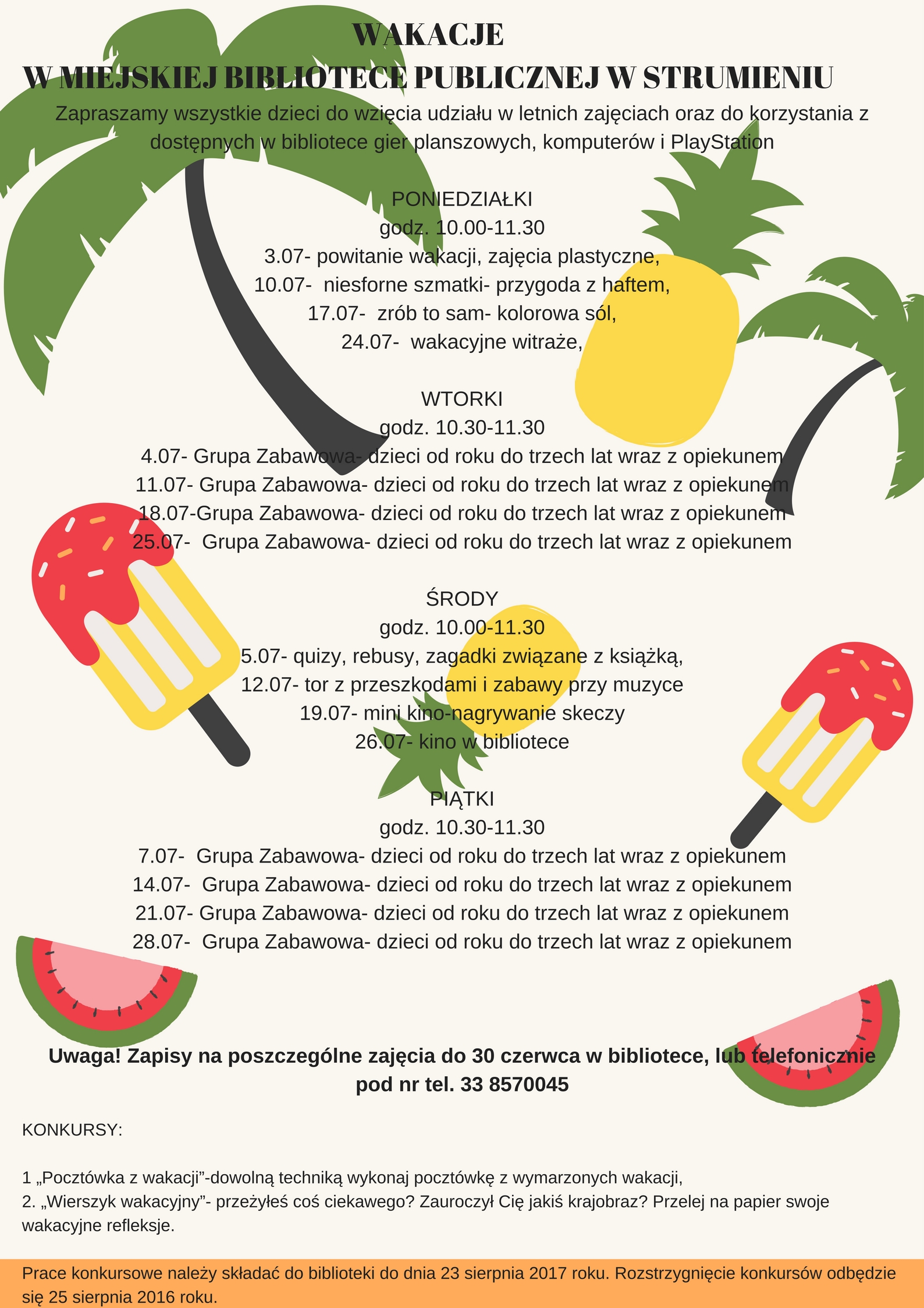 Plan zajęć wakacyjnych w Miejskiej Bibliotece Publicznej w Strumieniu