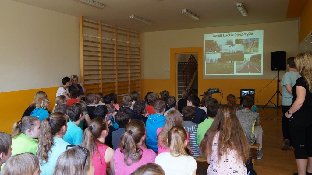 6 czerwca w szkole w Drogomyślu odbyło się kolejne spotkanie uczniów z Drogomyśla i czeskiego Vratimova, w ramach projektu „Aktywni na granicy”. Tym razem były to Międzynarodowe Rozgrywki Sportowe. Przygotowane prezentacje przedstawiły bliżej Czechom szkołę i sołectwo Drogomyśl. Ponadto goście zobaczyli pokaz zumby i walk sekcji Judo. Uczniów połączył taniec. Rywalizowali też na sportowo w piłce nożnej, siatkówce, wyścigach. Mogli lepiej poznać siebie i swoje zwyczaje. Kolejną okazją do współpracy społeczności szkolnych będzie też Dzień Regionalny w październiku.