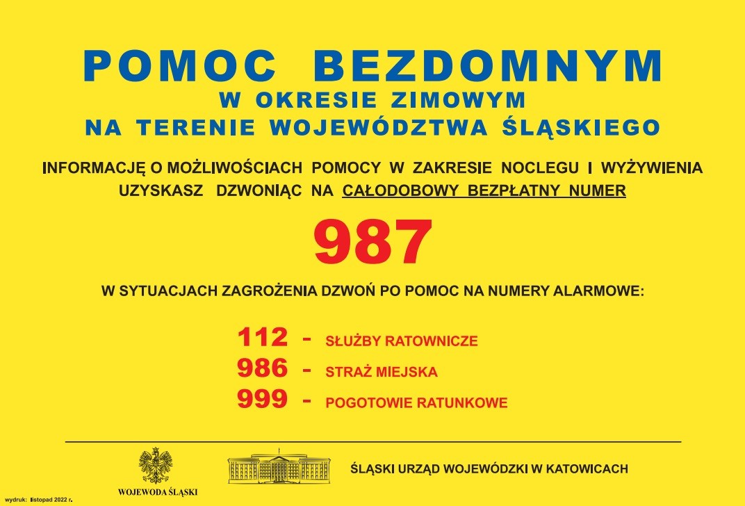 Jak co roku w okresie jesienno-zimowym Wojewódzkie Centrum Zarządzania Kryzysowego w Śląskim Urzędzie Wojewódzkim w Katowicach uruchomiło specjalną bezpłatną infolinię dla osób bezdomnych. Pod numerem 987 można uzyskać informacje dotyczące możliwej pomocy, noclegu oraz wyżywienia, lokalizacji schronisk oraz noclegowni, jak również dostępnej pomocy doraźnej.