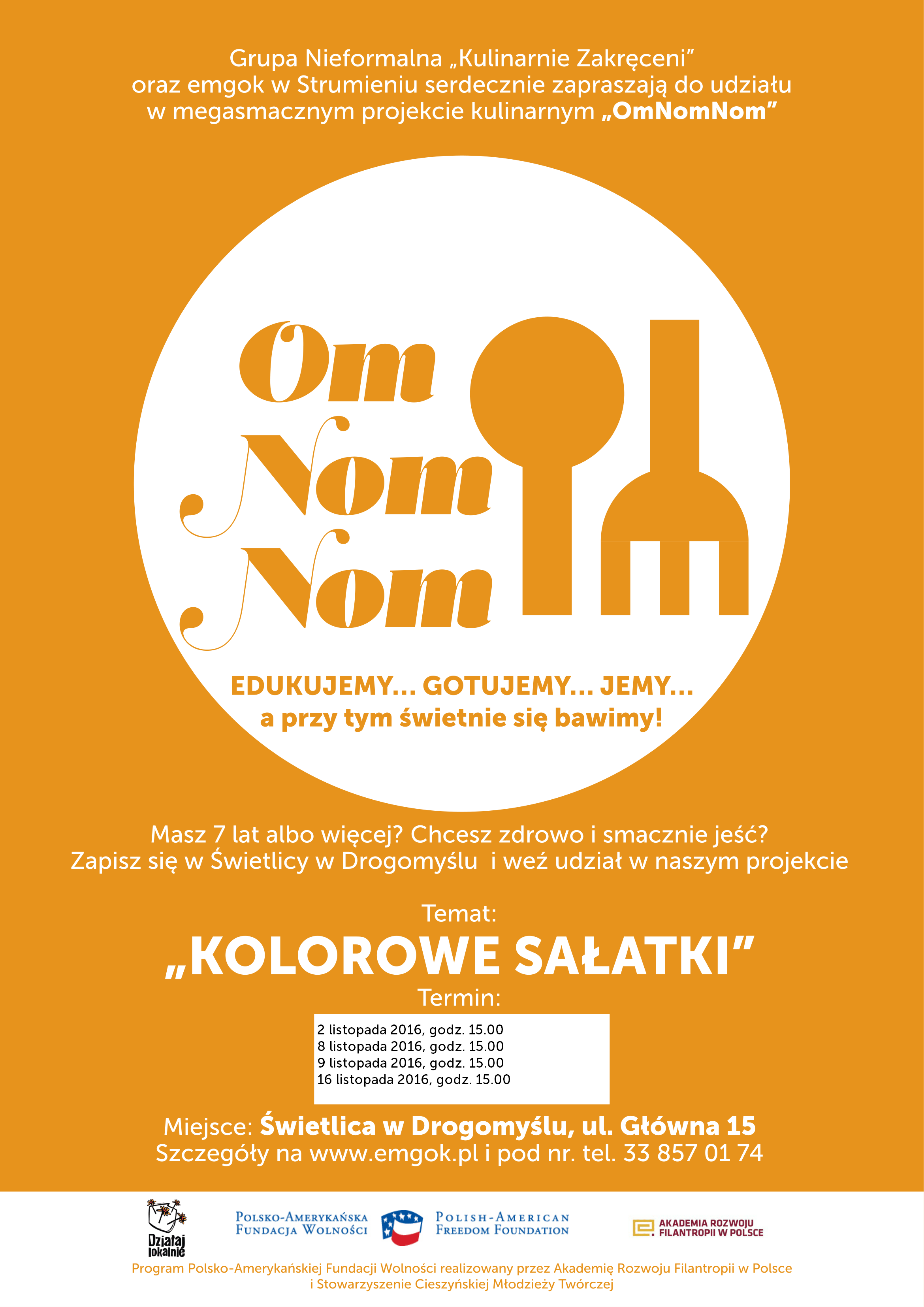 Projekt „OmNomNom” finansowany jest z Programu „Działaj Lokalnie” Polsko-Amerykańskiej Fundacji Wolności realizowany przez Akademię Rozwoju Filantropii w Polsce i Stowarzyszenie Cieszyńskiej Młodzieży Twórczej.