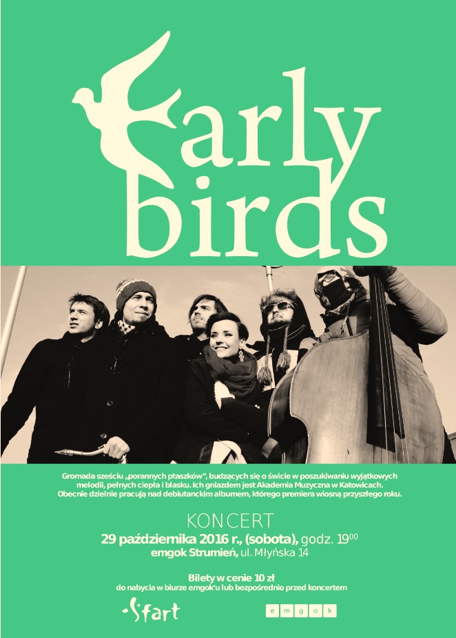 Na scenie wystąpi zespół Early Birds. Gromada sześciu „porannych ptaszków”, budzących się o świcie w poszukiwaniu wyjątkowych melodii, pełnych ciepła i blasku. Ich gniazdem jest Akademia Muzyczna w Katowicach. Obecnie dzielnie pracują nad debiutanckim albumem, którego premiera wiosną przyszłego roku.