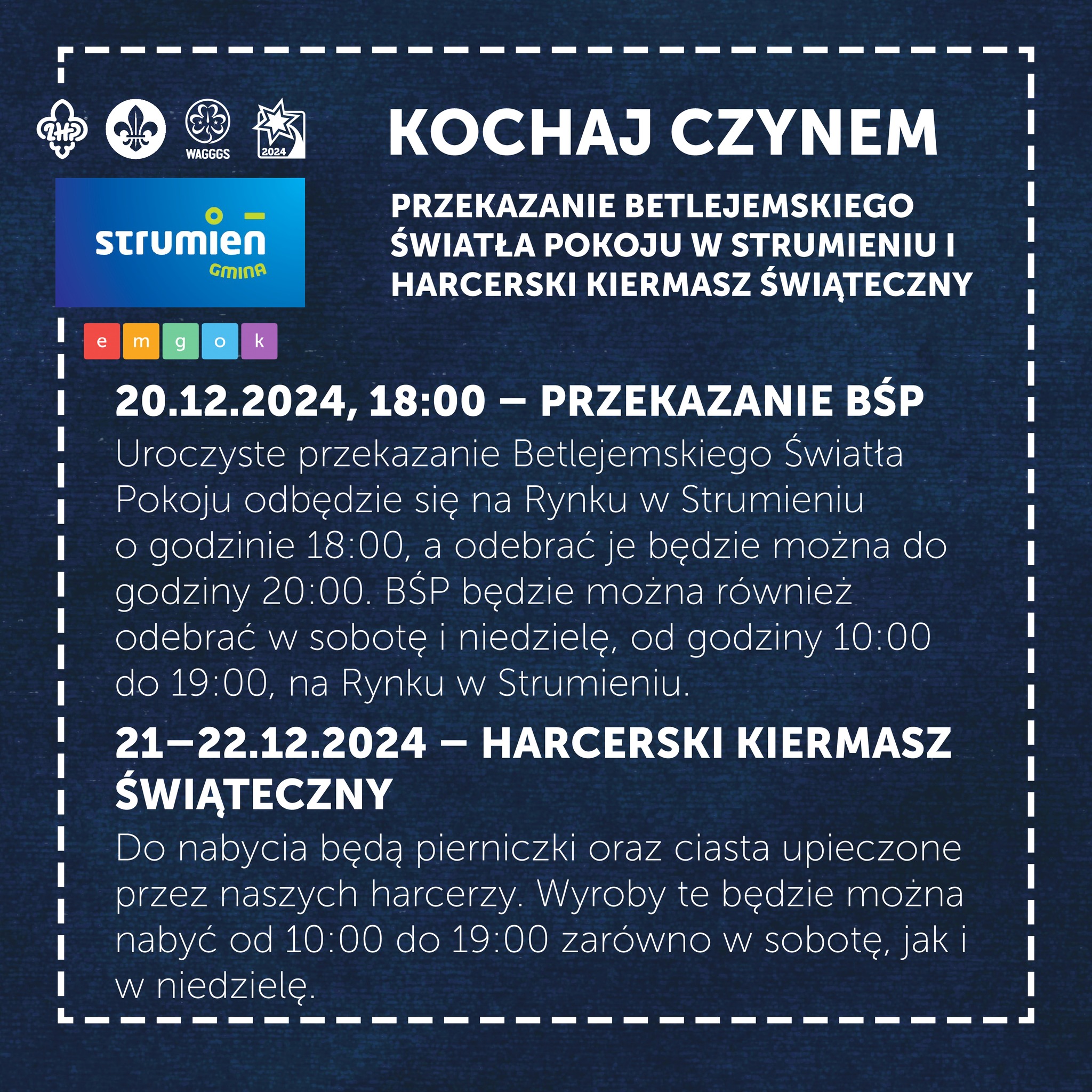 Ale to jeszcze nie wszystko! Działalność Drużyny Harcerskiej Zielone Siódemki będzie można wesprzeć podczas Harcerskiego Kiermaszu Świątecznego, podczas którego będą dostępne pierniczki oraz ciasta upieczone przez samych harcerzy. Na kiermasz zapraszamy na strumieński rynek w weekend 21-22 grudnia od 10:00 do 19:00.