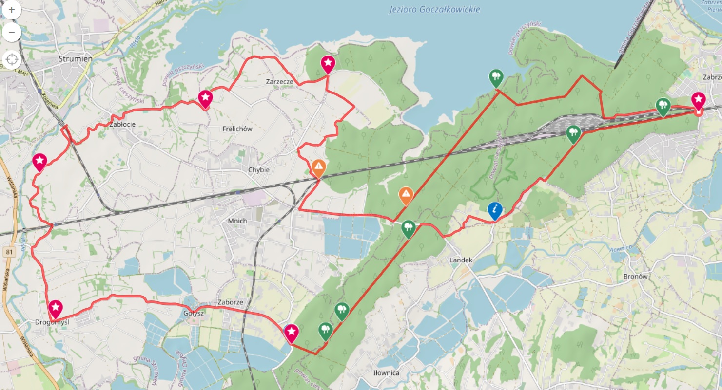 Trasa prowadzi również przez gminę Strumień. W Drogomyślu biegnie przez ul. Wierzbina, Modrzewiową, Wiejską, Kolejową, aż do dworca kolejowego PKP Drogomyśl. Podczas przejażdżki mijamy kościół ewangelicko-augsburski. Za stacją PKP należy wjechać w ul. Pasieczną, aż do torów kolejowych, które mija się pod tunelem. Wjeżdżamy w ul. Miodową i Orzechową, które prowadzą do centrum Zabłocia. Przejeżdżamy również przez fragment ulicy Bielskiej, prowadzącej ze Strumienia do Jasienicy. Następnie wjeżdżamy w boczną ulicę Rolną przybliżając się do wałów zbiornika Goczałkowickiego. Po jej przejechaniu opuszczamy gminę Strumień.