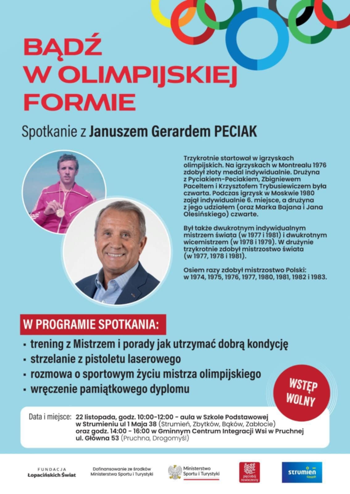 Spotkanie z Mistrzem Olimpijskim w Pięcioboju Nowoczesnym Januszem Gerardem Pyciakiem - Peciakiem odbyło się 22 listopada w Szkole Podstawowej w Strumieniu oraz w Gminnym Centrum Integracji Wsi w Pruchnej.