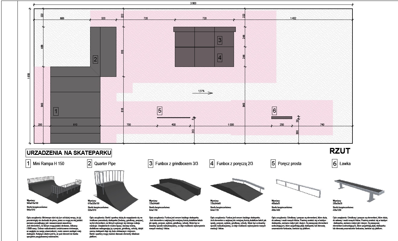 Skatepark według projektu ma wymiary 39 m x 16 m. W projekcie znalazło się 6 urządzeń. Teren będzie monitorowany, oświetlony i ogrodzony. Ciekawą lokalizacją dla skateparku wydawał się być teren przy basenie, ale w związku z realizacją kompleksowego zagospodarowania tego terenu ze środków europejskich, do czasu trwałości projektu 2020 r. – nie możemy wprowadzać tam zmian.