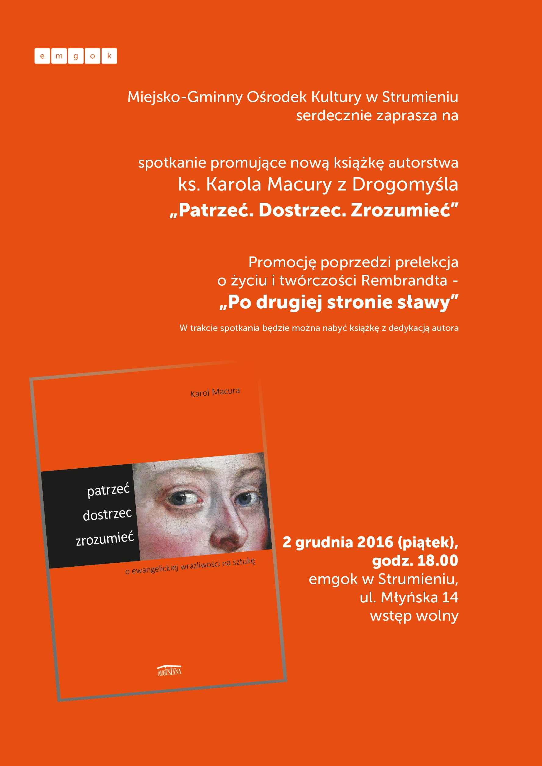 W najbliższy piątek 2 grudnia br. o godz. 18.00 w Miejsko-Gminnym Ośrodku Kultury w Strumieniu odbędzie się spotkanie promujące nową książkę ks. Karola Macury z Drogomyśla pt. „Patrzeć. Dostrzec. Zrozumieć.” Promocję poprzedzi prelekcja o życiu i twórczości Rembrandta „Po drugiej stronie sławy”. W trakcie spotkania będzie można nabyć książkę z dedykacją autora.