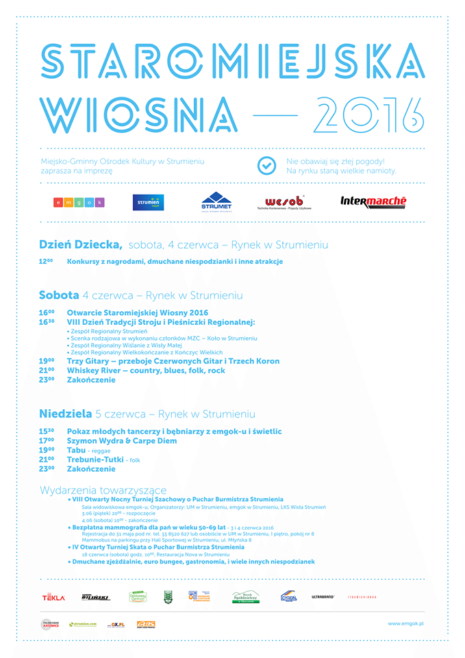 Sala widowiskowa emgok-u, Organizatorzy: UM w Strumieniu, emgok w Strumieniu LKS Wisła Strumień, 3.06 (piątek) 20:00 – rozpoczęcie, 4.06 (sobota) 10:00 – zakończenie.