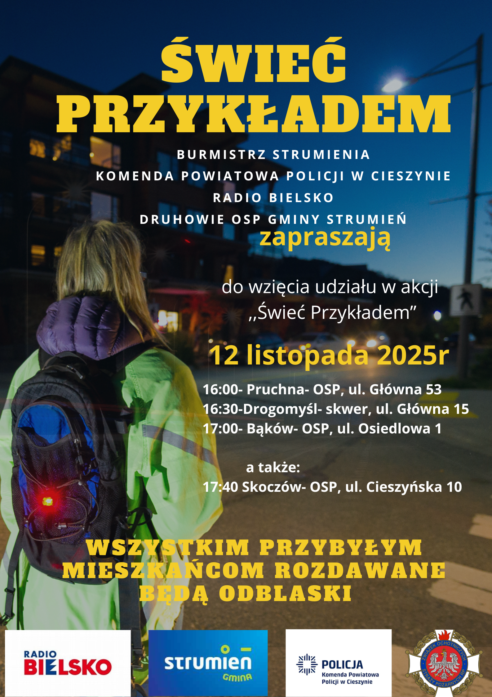 Burmistrz Strumienia Anna Grygierek, Komenda Powiatowa Policji w Cieszynie, Radio Bielsko oraz Druhowie Ochotniczych Straży Pożarnych z terenu gminy Strumień zapraszają mieszkańców do udziału w akcji „Świeć Przykładem”.