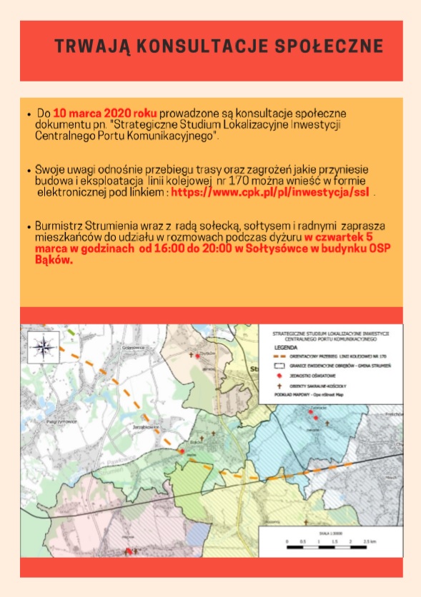 Burmistrz Strumienia wraz z radą sołecką, sołtysem i radnymi zaprasza mieszkańców do udziału w rozmowach dotyczących planowanej budowy Centralnego Portu Komunikacyjnego podczas dyżuru