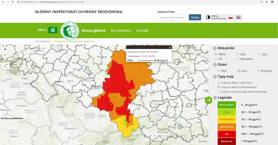 W dniu dzisiejszym jakość powietrza na obszarze województwa śląskiego ze względu na poziom pyłu zawieszonego jest dostateczna i zła.