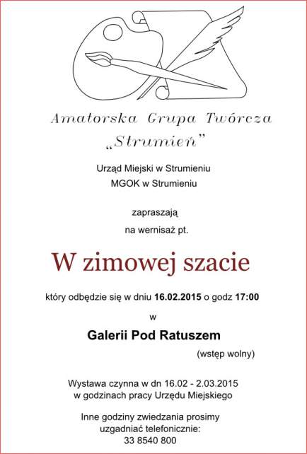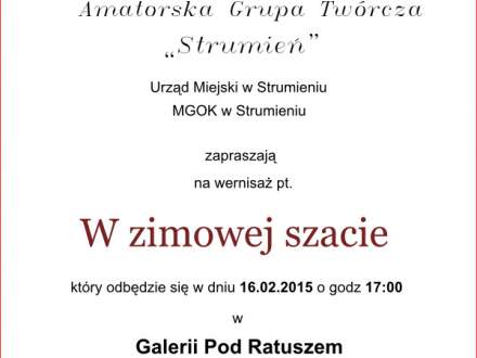 Amatorska Grupa Twórcza "Strumień” , Urząd Miejski i Miejsko- Gminny Ośrodek Kultury w Strumieniu serdecznie zapraszają na wernisaż wystawy pn. "W zimowej szacie", który odbędzie się 16.02.2015r. o godz. 17:00 w Galerii po Ratuszem w Strumieniu. Szczegóły na plakacie.