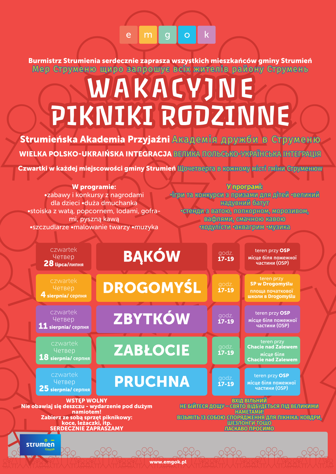 Nie obawiaj się deszczu – wydarzenie pod dużym namiotem! Zabierz ze sobą sprzęt piknikowy: koce, leżaczki, itp. Pikniki będą wspaniałą okazją do wielkiej polsko-ukraińskiej integracji i spotkań Strumieńskiej Akademii Przyjaźni!