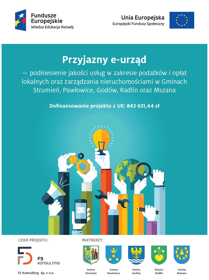 Projekt „Przyjazny e-urząd – podniesienie jakości usług w zakresie podatków i opłat lokalnych oraz zarządzania nieruchomościami w Gminach Strumień, Pawłowice, Godów, Radlin oraz Mszana” jest realizowany w ramach Programu Operacyjnego Wiedza Edukacja Rozwój 2014-2020 współfinansowanego z Europejskiego Funduszu Społecznego. Koszt realizacji tego projektu we wszystkich pięciu gminach to prawie milion złotych. 85 % kosztów pokrywa dofinansowanie z funduszy unijnych.