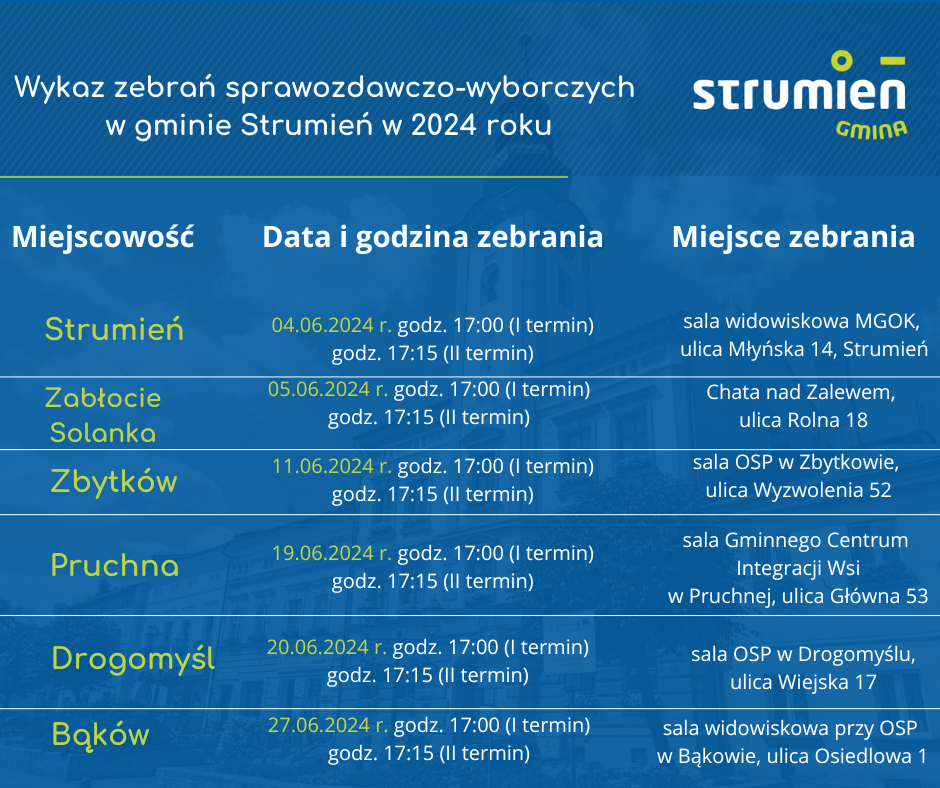 Za nami już zebranie w sołectwie Zabłocie, a najbliższe ze spotkań zaplanowane jest w Strumieniu (sala widowiskowa emgok) 4 czerwca, godzina: 17:00 (I termin) godz. 17:15 (II termin).