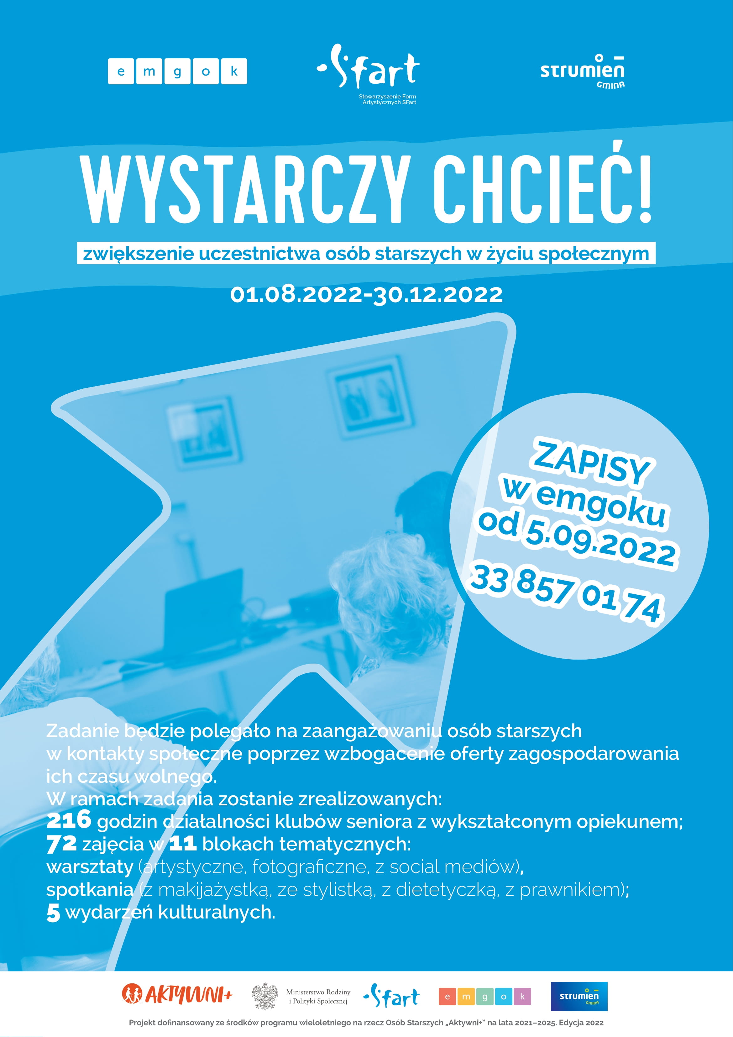 Oferta skierowana jest do osób, które ukończyły 60. rok życia. Zapisy w siedzibie Stowarzyszenia od 5 września 2022 (ul. Młyńska 14, emgok).